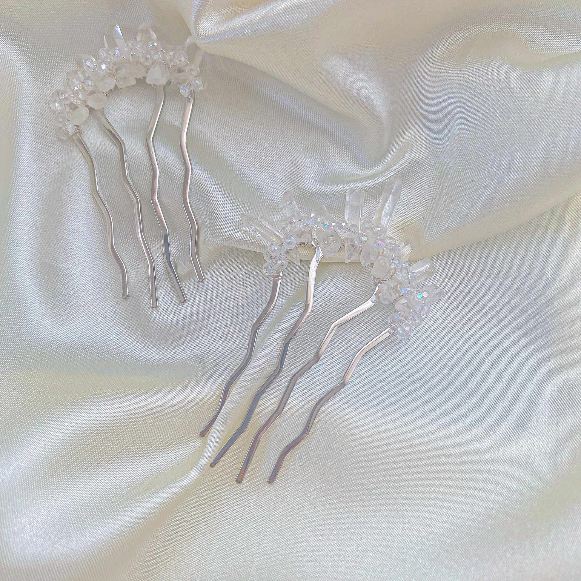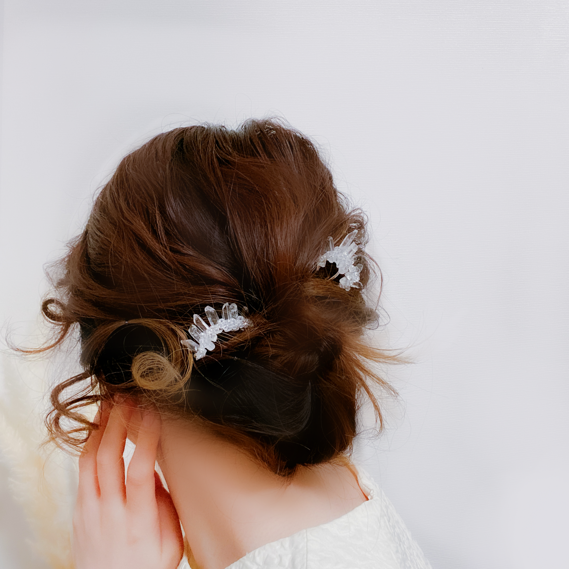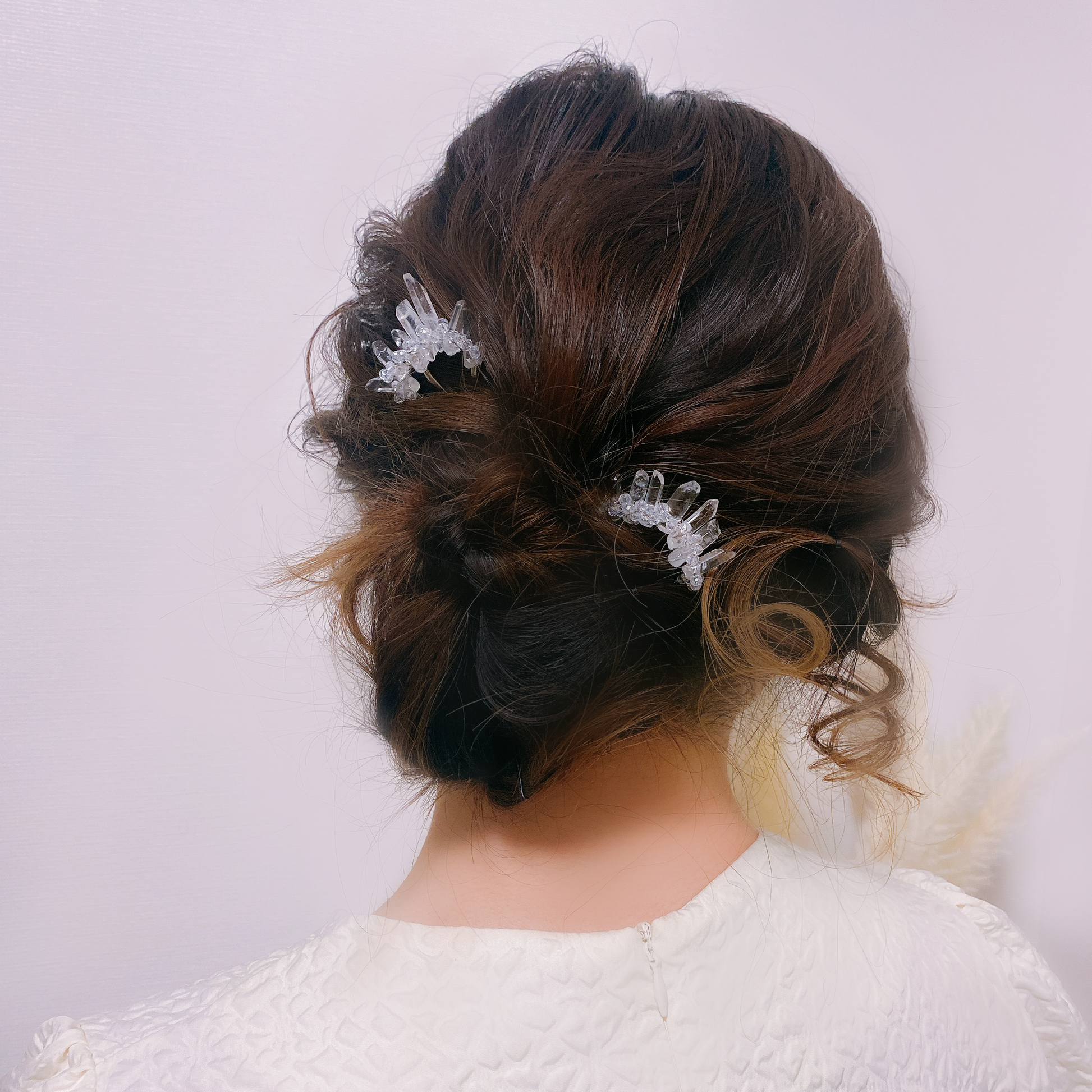 クリスタルをふんだんに使用したキラキラをメインのヘッドドレス✨透明感が高いクリスタルを使用しており、編み込みビーズもオーロラの煌めきがあるものを散りばめました♡お団子や編みおろしヘア、ショート花嫁様にはサイドで◎色んなヘアアレンジにご使用いただけます🕊とってもキュートで目を引くアイテムです💕2本セットの販売です。