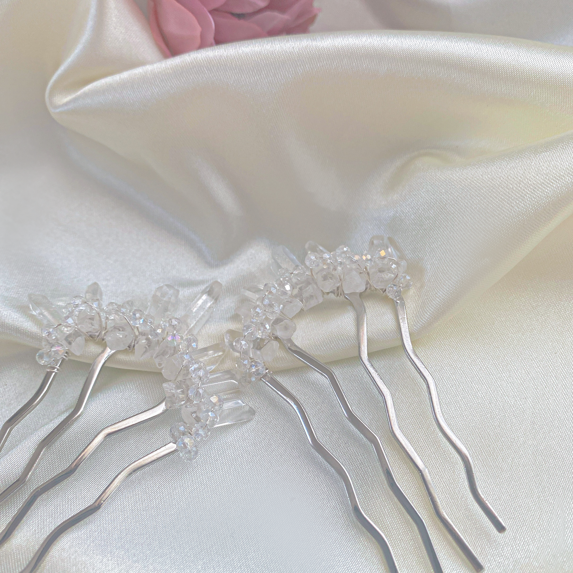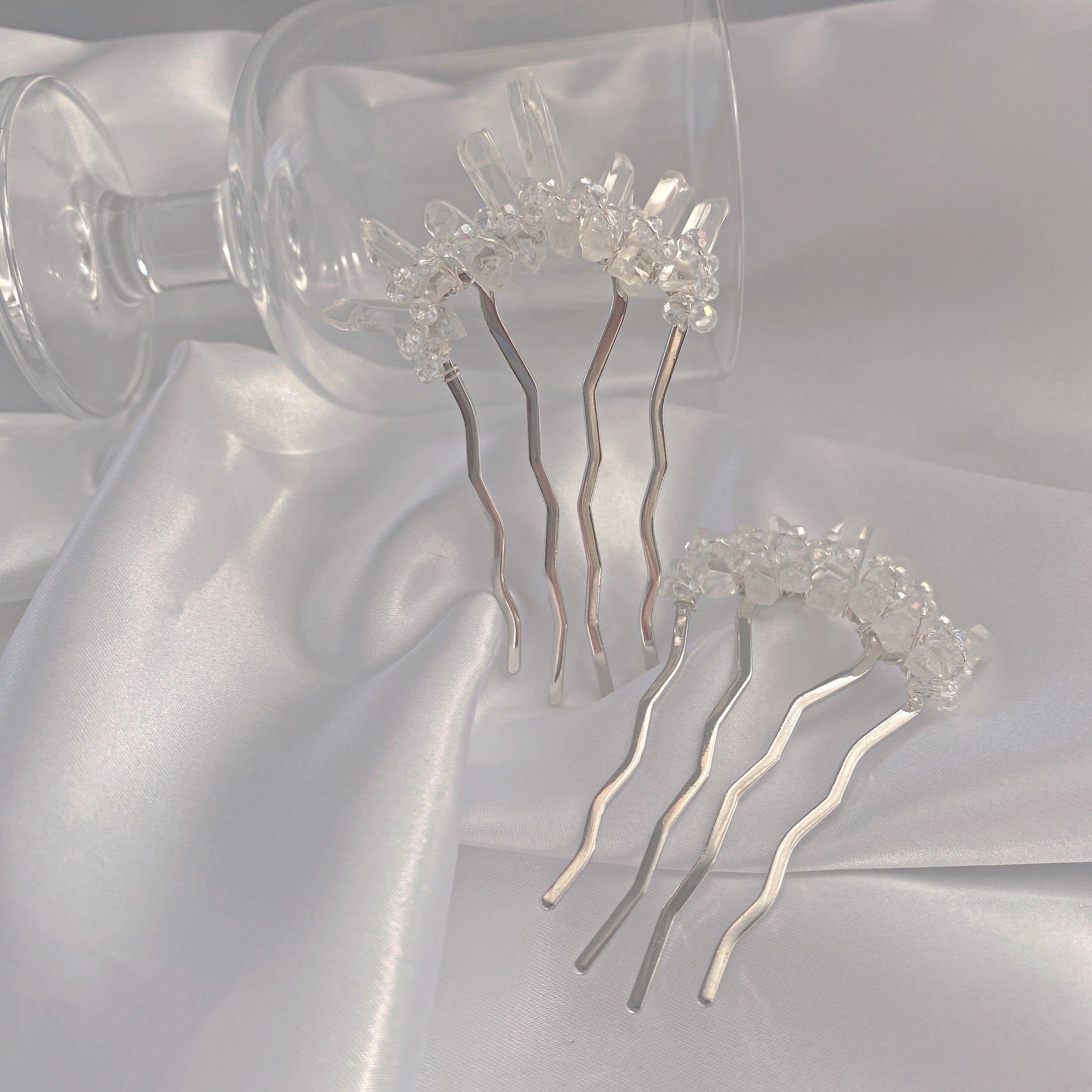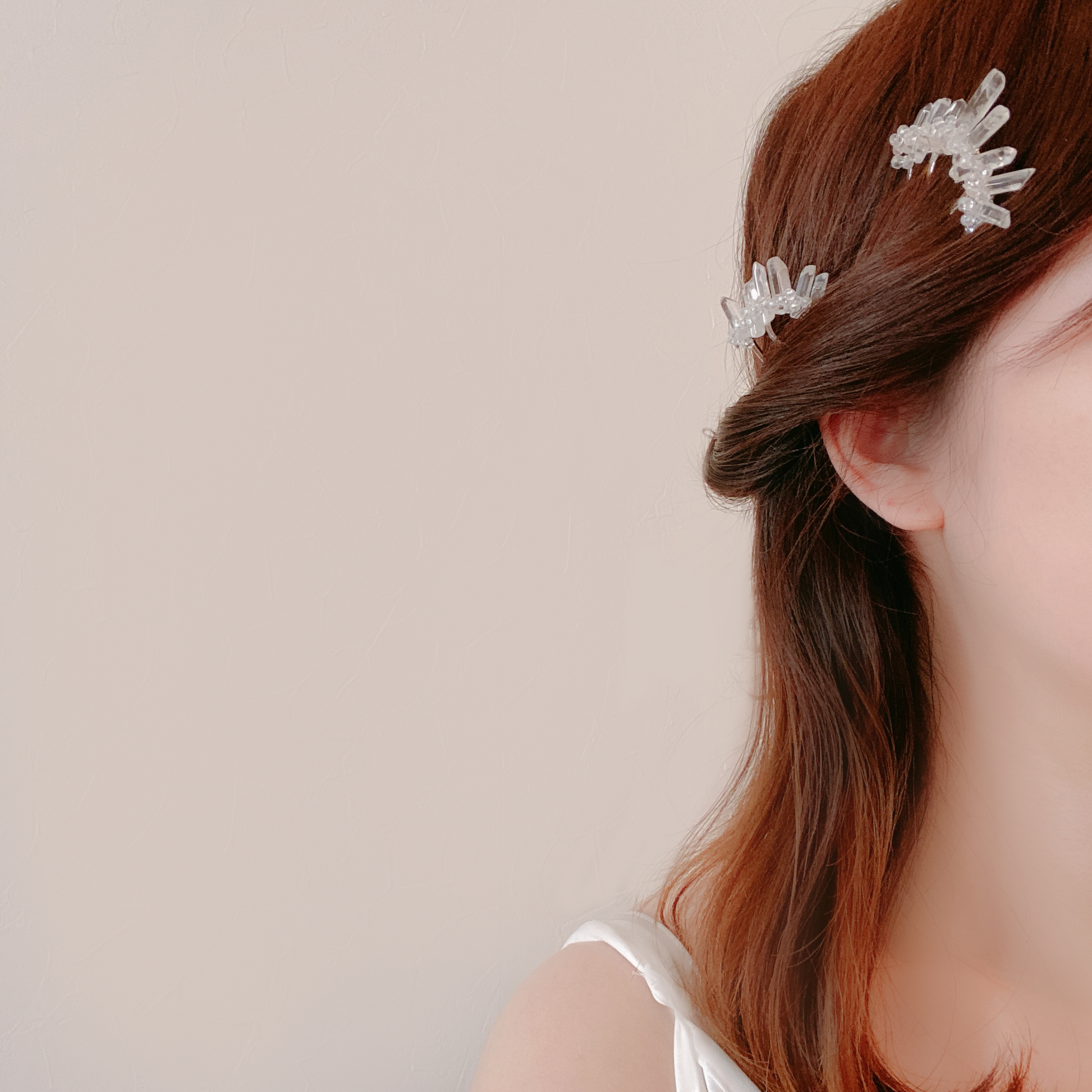 クリスタルをふんだんに使用したキラキラをメインのヘッドドレス✨透明感が高いクリスタルを使用しており、編み込みビーズもオーロラの煌めきがあるものを散りばめました♡お団子や編みおろしヘア、ショート花嫁様にはサイドで◎色んなヘアアレンジにご使用いただけます🕊とってもキュートで目を引くアイテムです💕2本セットの販売です。