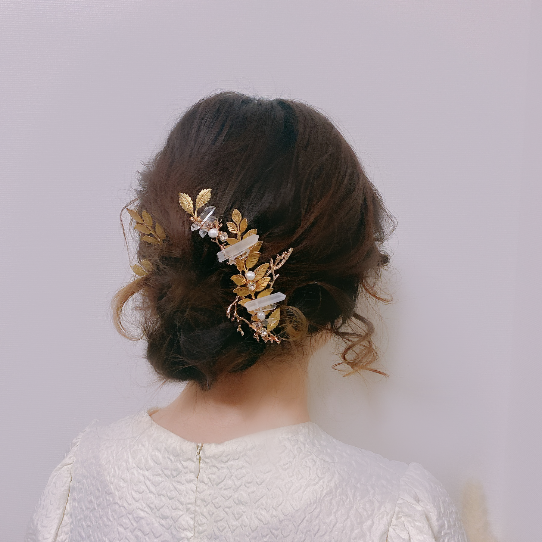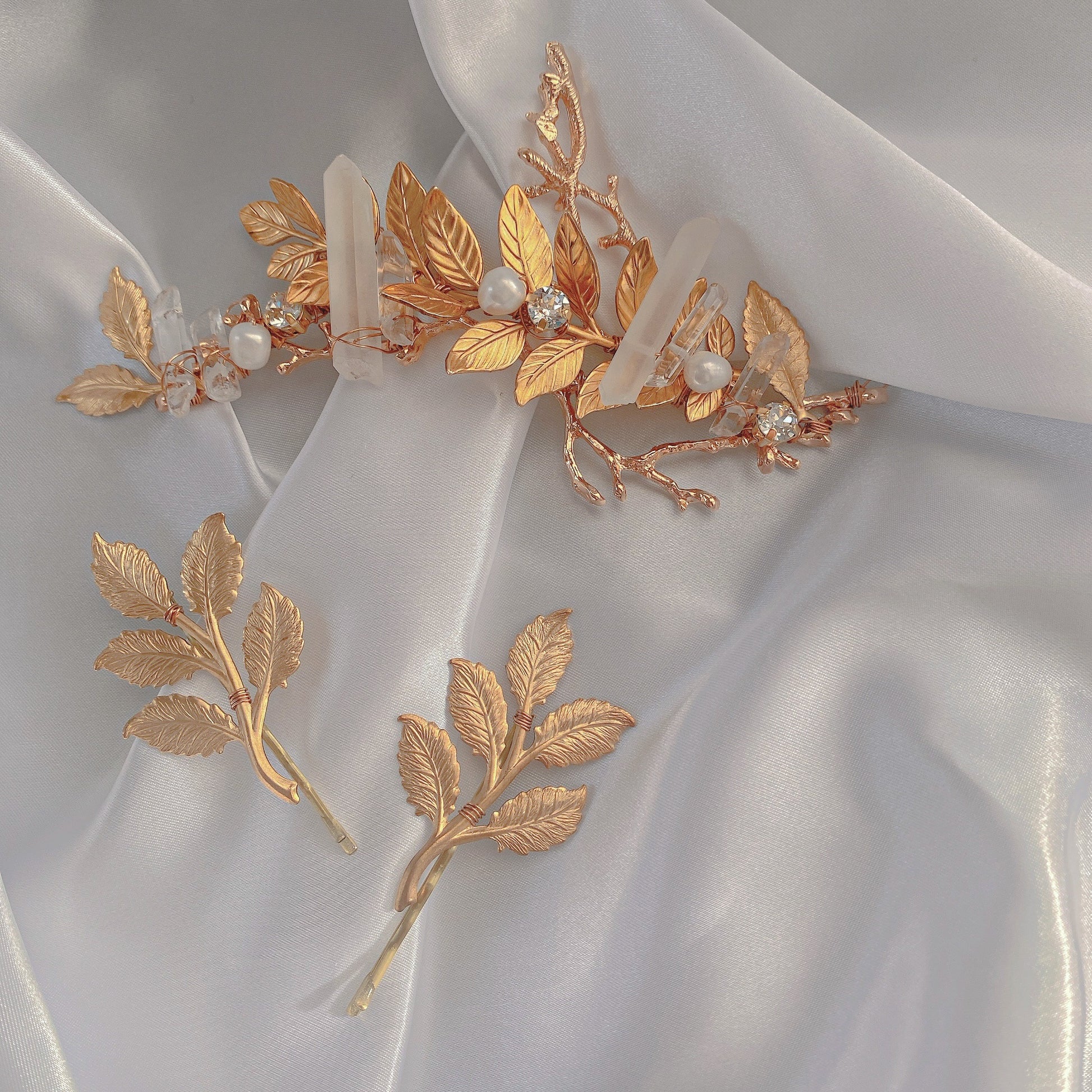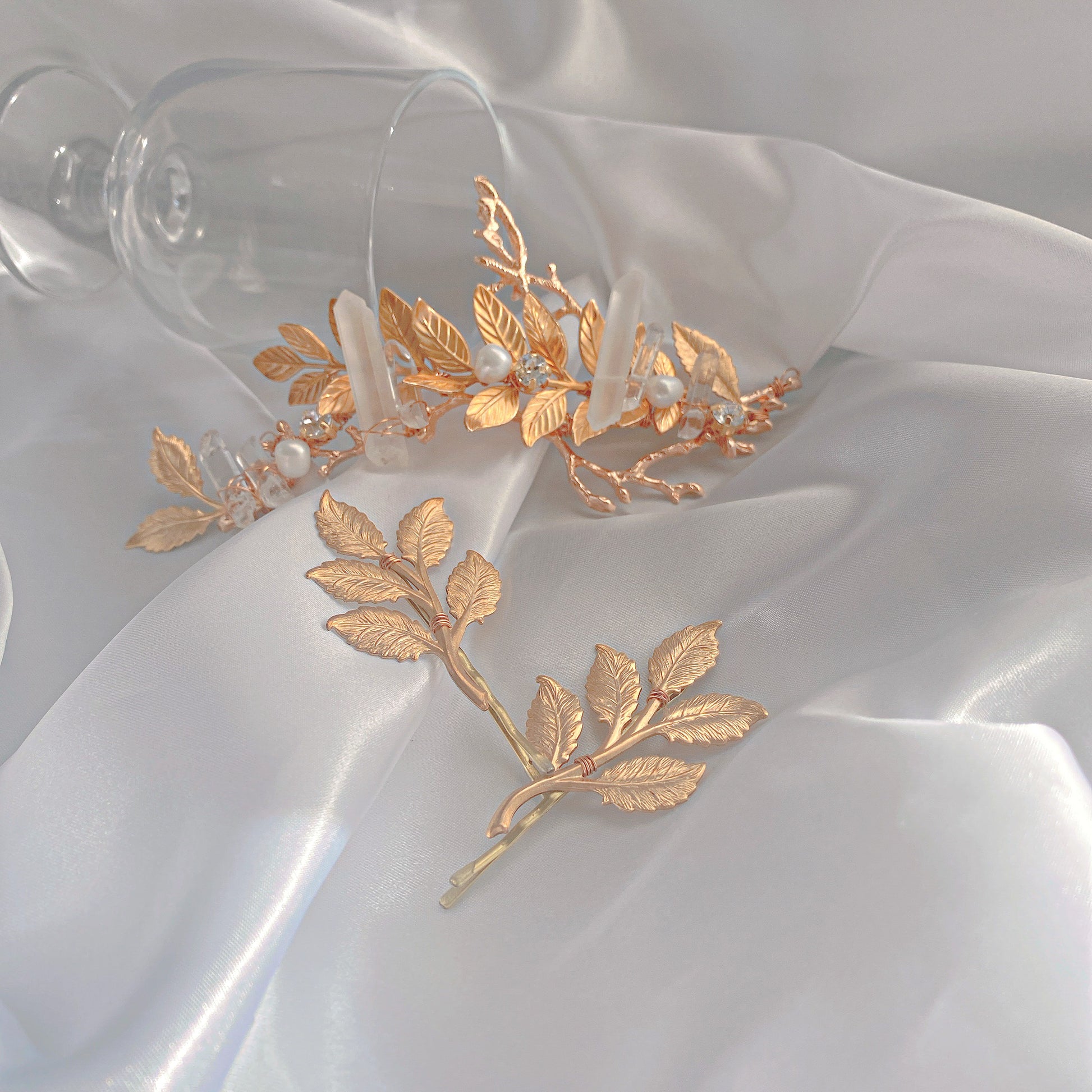 小枝リーフと水晶を掛け合わせた存在感のあるヘッドドレス✨トレンドを押さえた水晶とリーフをあしらいヘルシー仕様の花嫁様にぴったりです♡まだヘアスタイルが決まっていない方、カチューシャより万能にヘッドドレスを楽しみたい方におすすめです🌿ロングヘアの花嫁様には大胆に縦にお使い頂いても素敵です💕シニヨンヘア、編みおろし、ダウンヘアなどにぴったりです♡リーフのヘアピンの3点セットです🪡