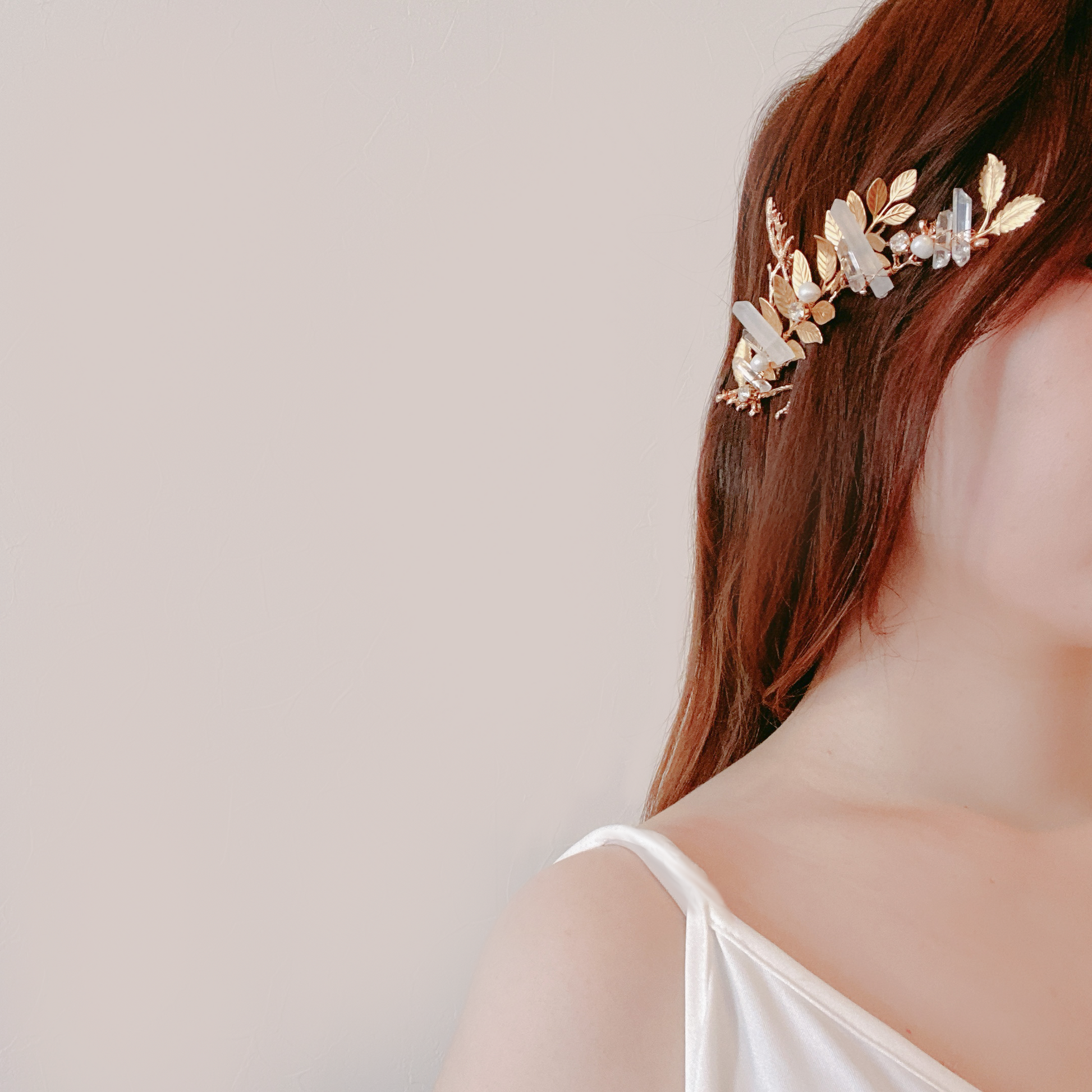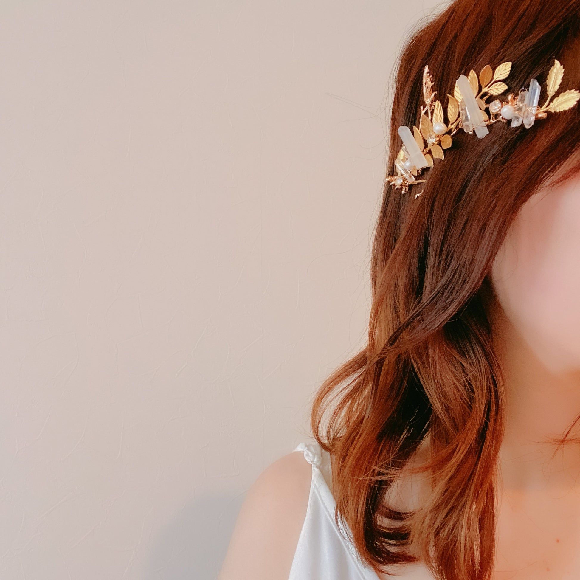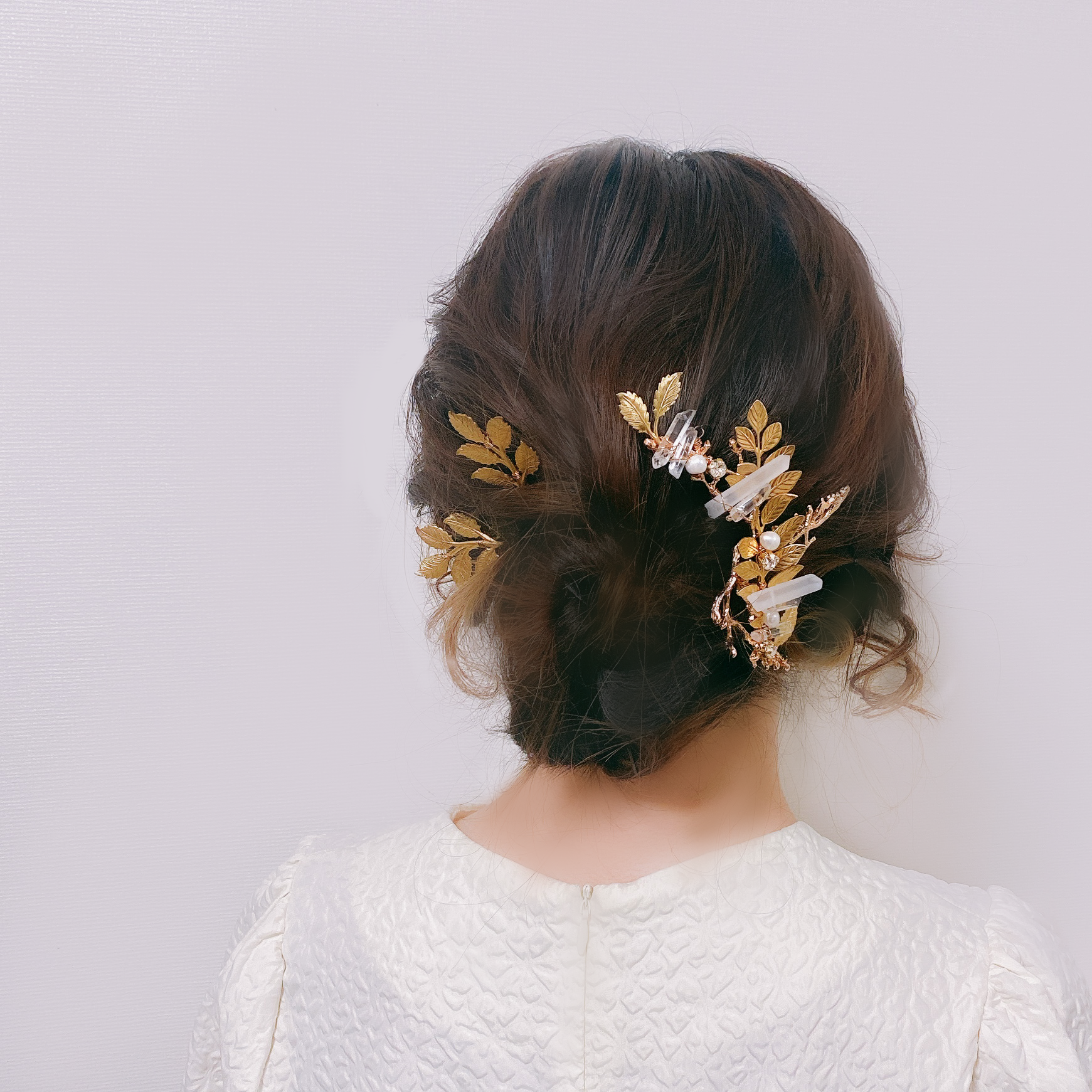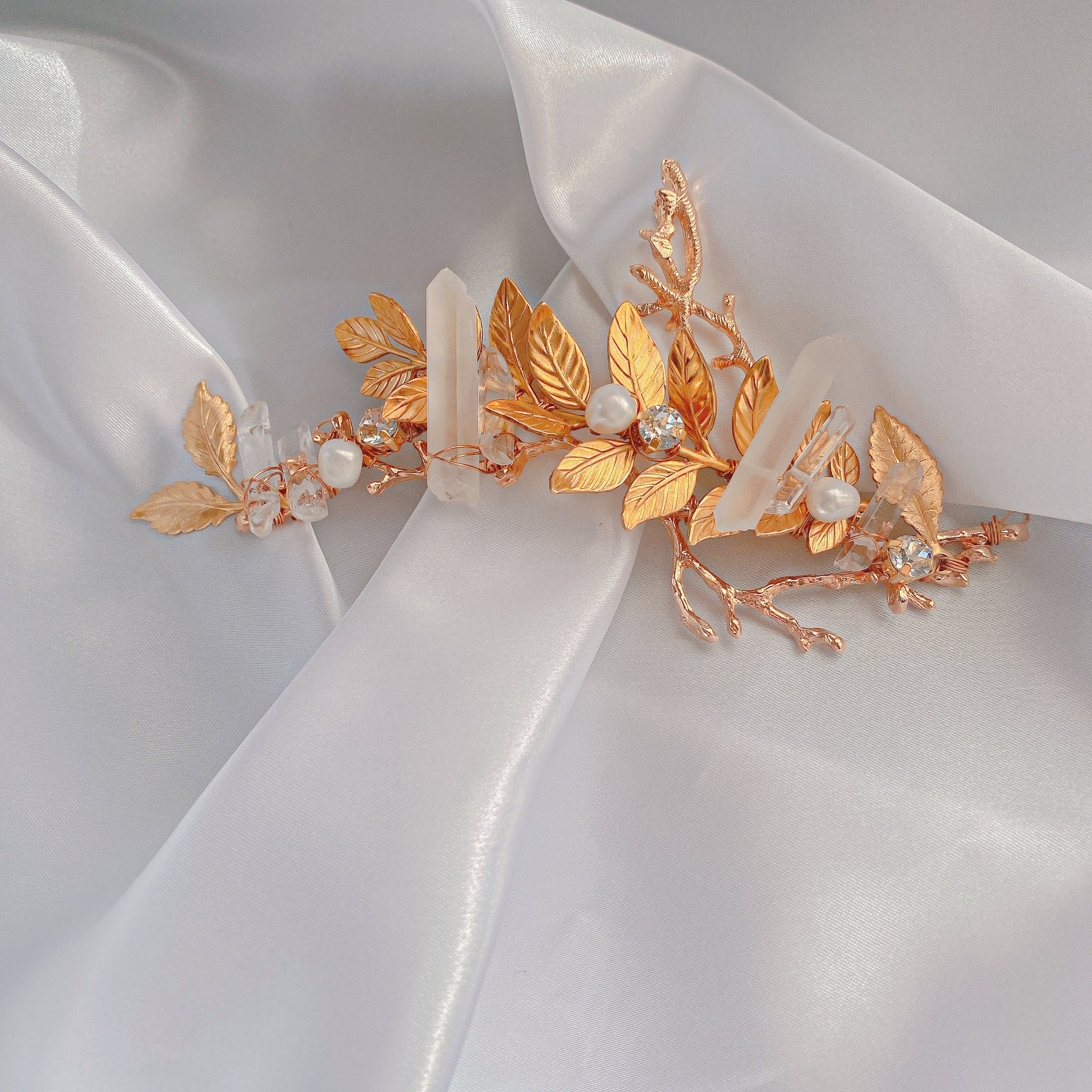 小枝リーフと水晶を掛け合わせた存在感のあるヘッドドレス✨トレンドを押さえた水晶とリーフをあしらいヘルシー仕様の花嫁様にぴったりです♡まだヘアスタイルが決まっていない方、カチューシャより万能にヘッドドレスを楽しみたい方におすすめです🌿ロングヘアの花嫁様には大胆に縦にお使い頂いても素敵です💕シニヨンヘア、編みおろし、ダウンヘアなどにぴったりです♡リーフのヘアピンの3点セットです🪡