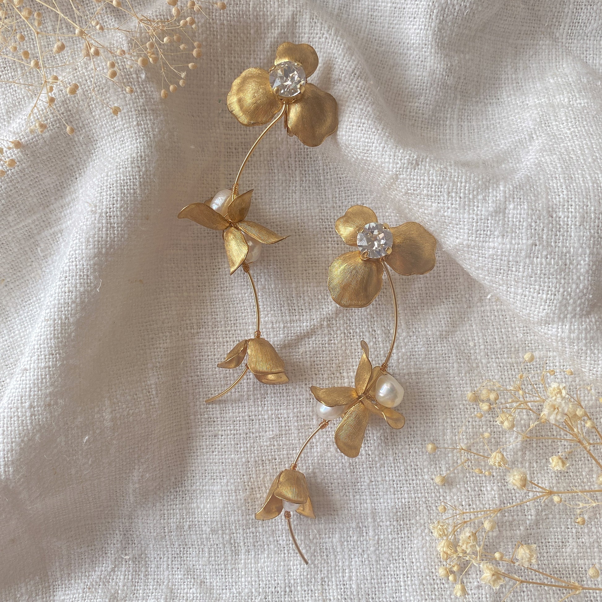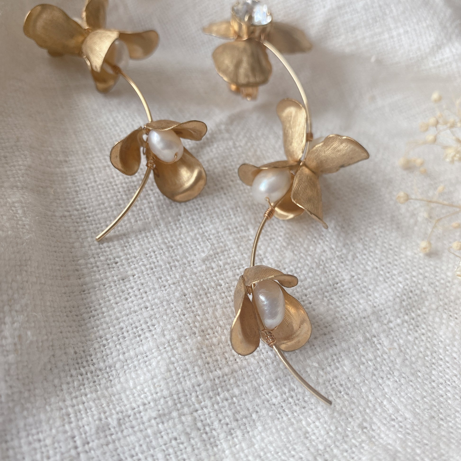 キュートな丸みのあるお花に、ウェーブ感のあるチェーンで動きを出した、個性的ガーリーなピアス&イヤリングです♡スワロフスキーできらめきも一緒に✨