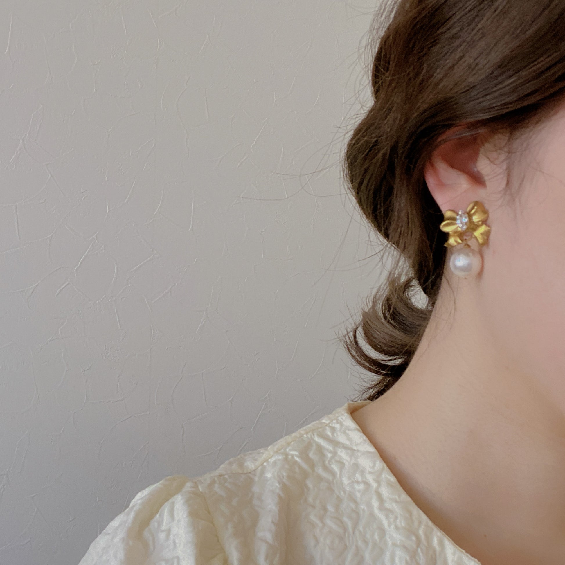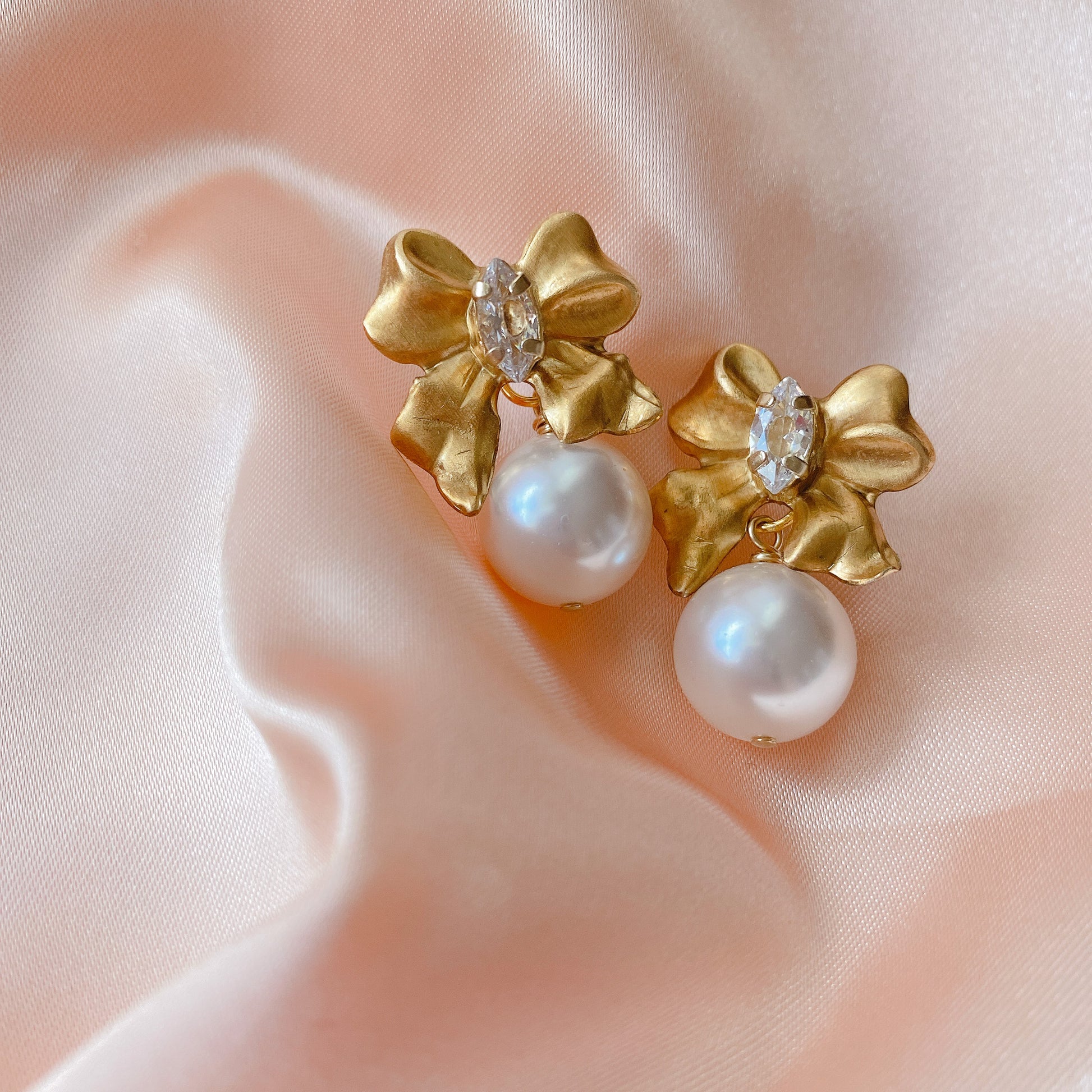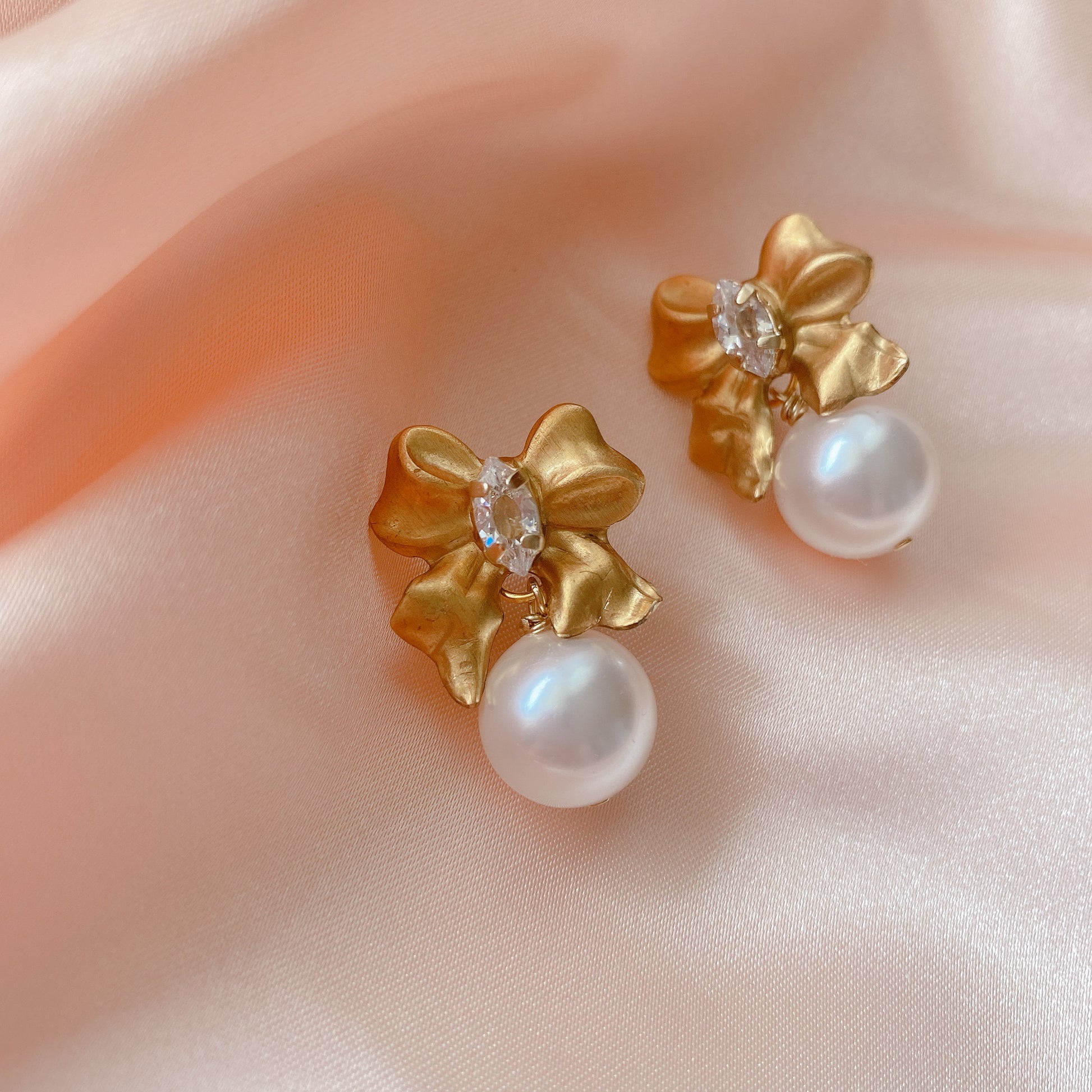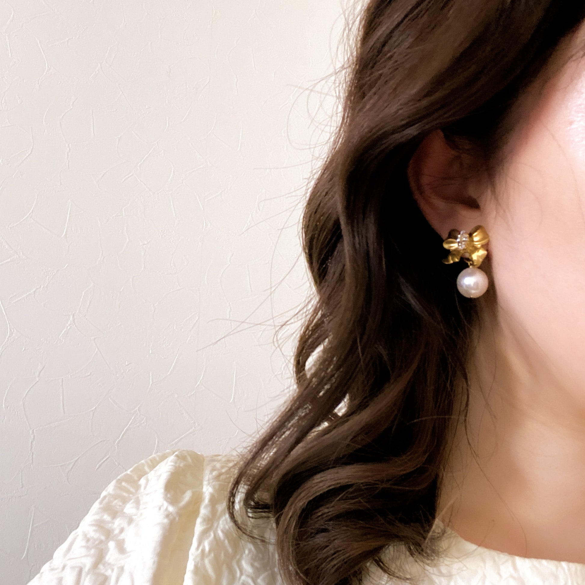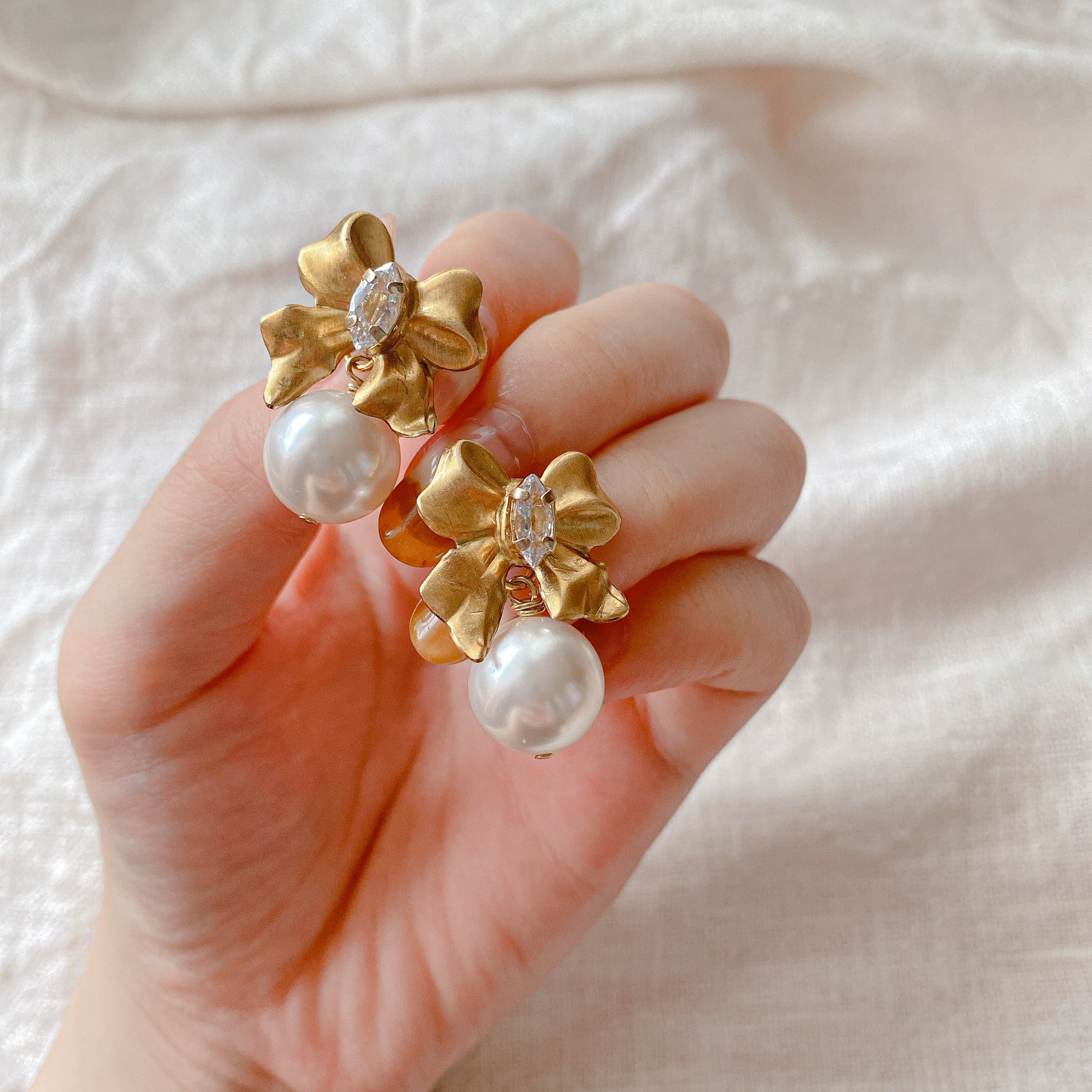 アンティークリボンと大ぶりのパールがおしゃれな雰囲気を演出🎀日常使いからお呼ばれコーデと、多様な場面で着用出来るようにお仕上げしました✨小ぶりながら、キラッと光るビジューが存在感大◎パールがふりふり揺れて可愛いです🤍