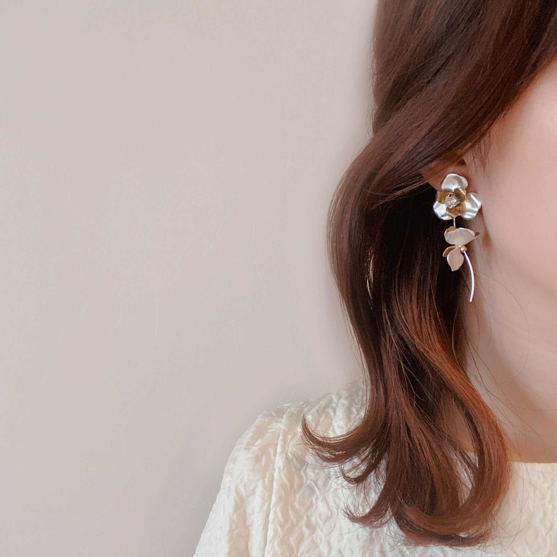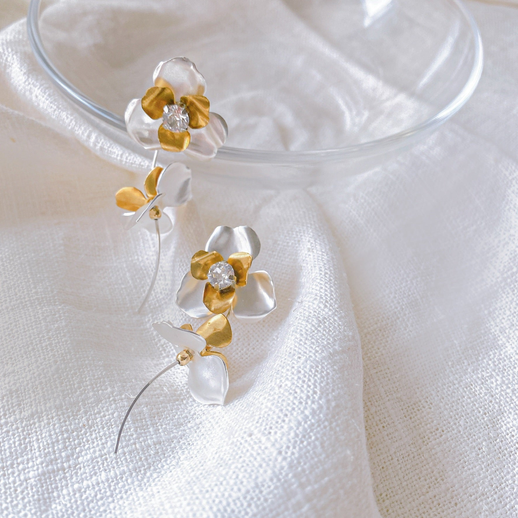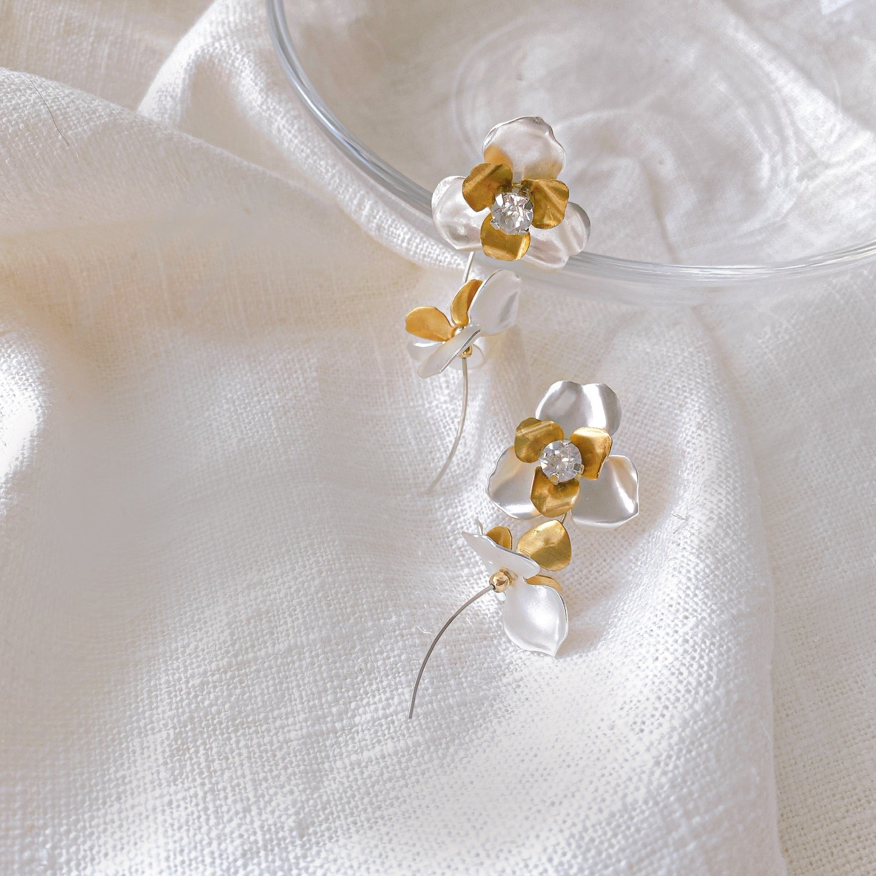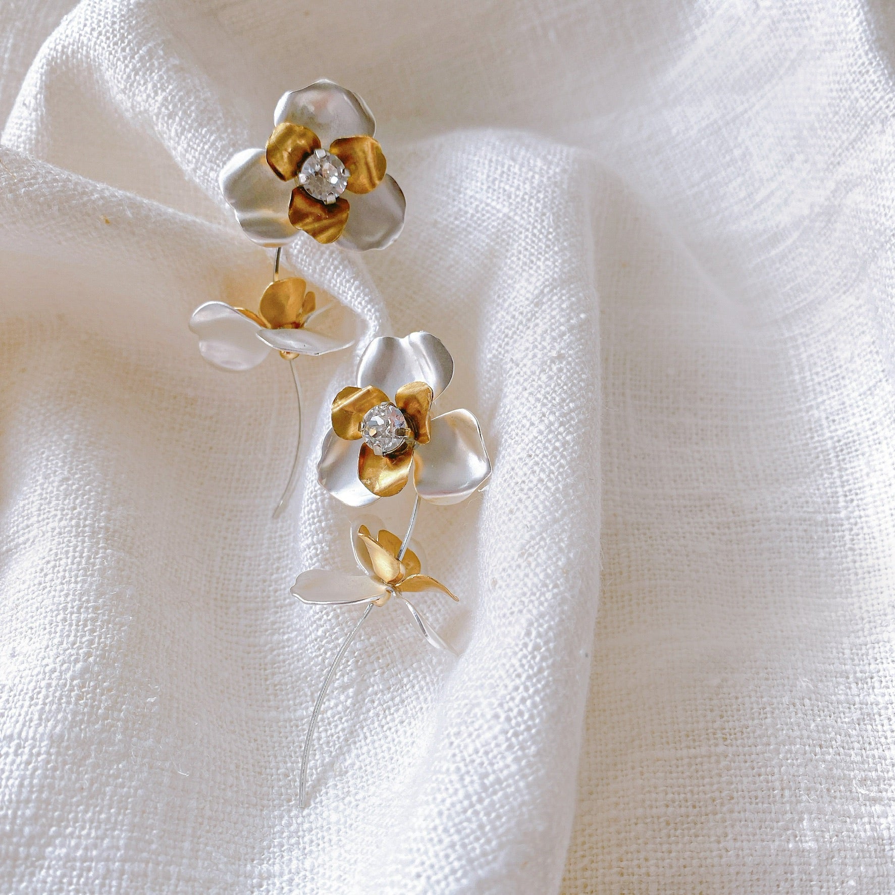 silver×goldの三つ葉組み合わせが大人可愛い♡華奢なラインながら立体感があるリーフ部分とビジューで存在感大です🍃ウェデングドレスやカラードレスにもお似合いです💕ウェーブ感がお洒落な雰囲気を引き立たせてくれます✨お呼ばれコーデからウェデングまでお使いいただけます◎