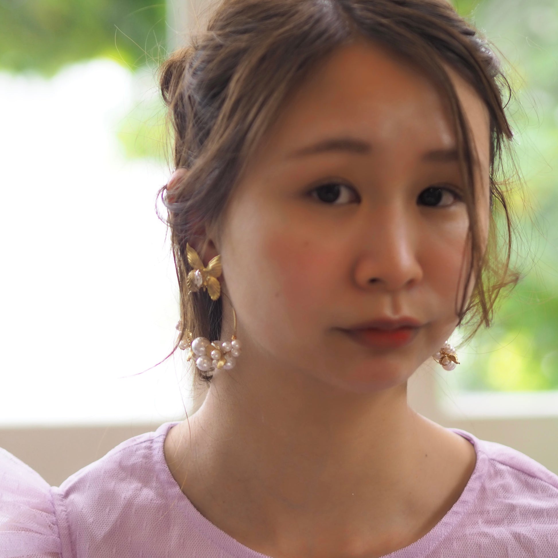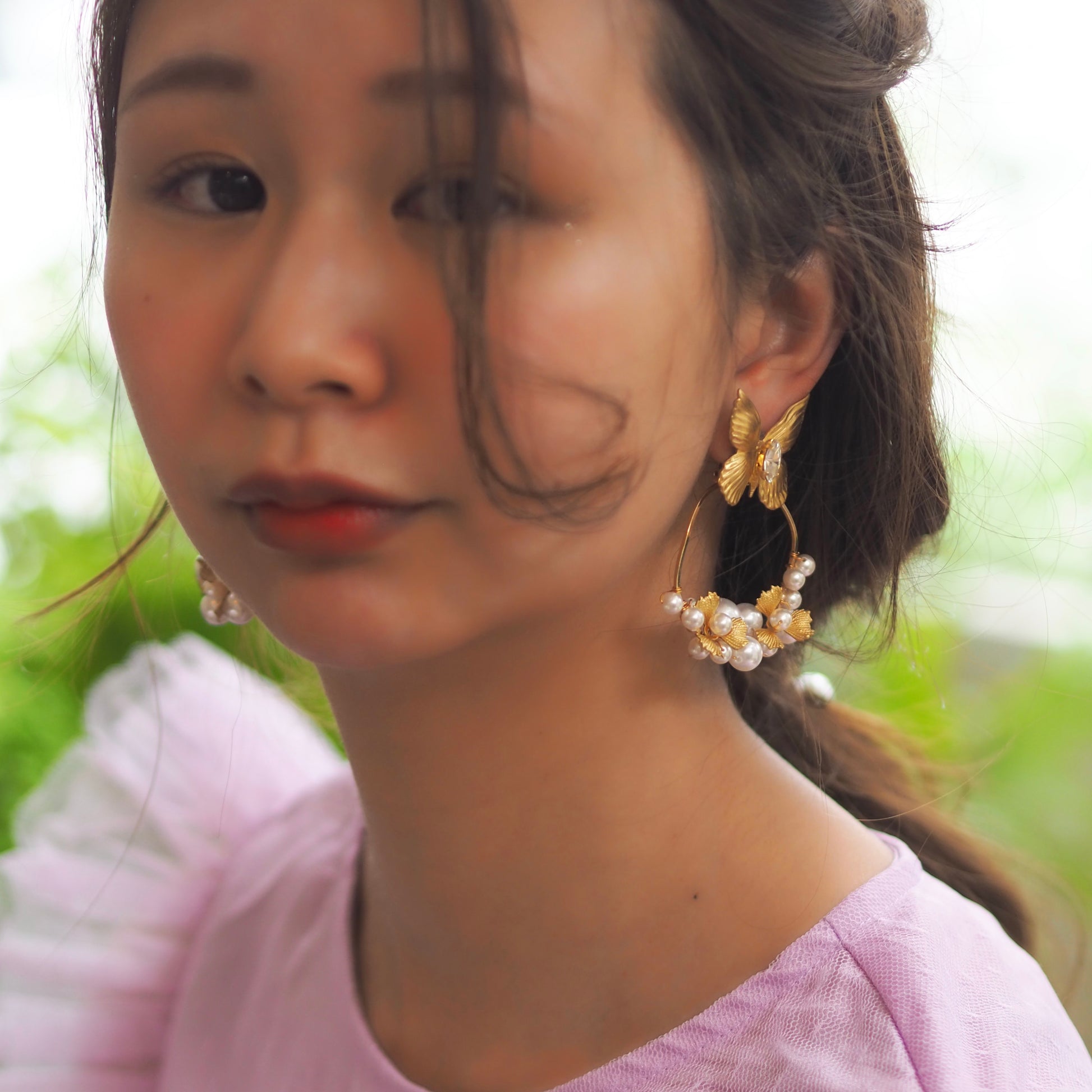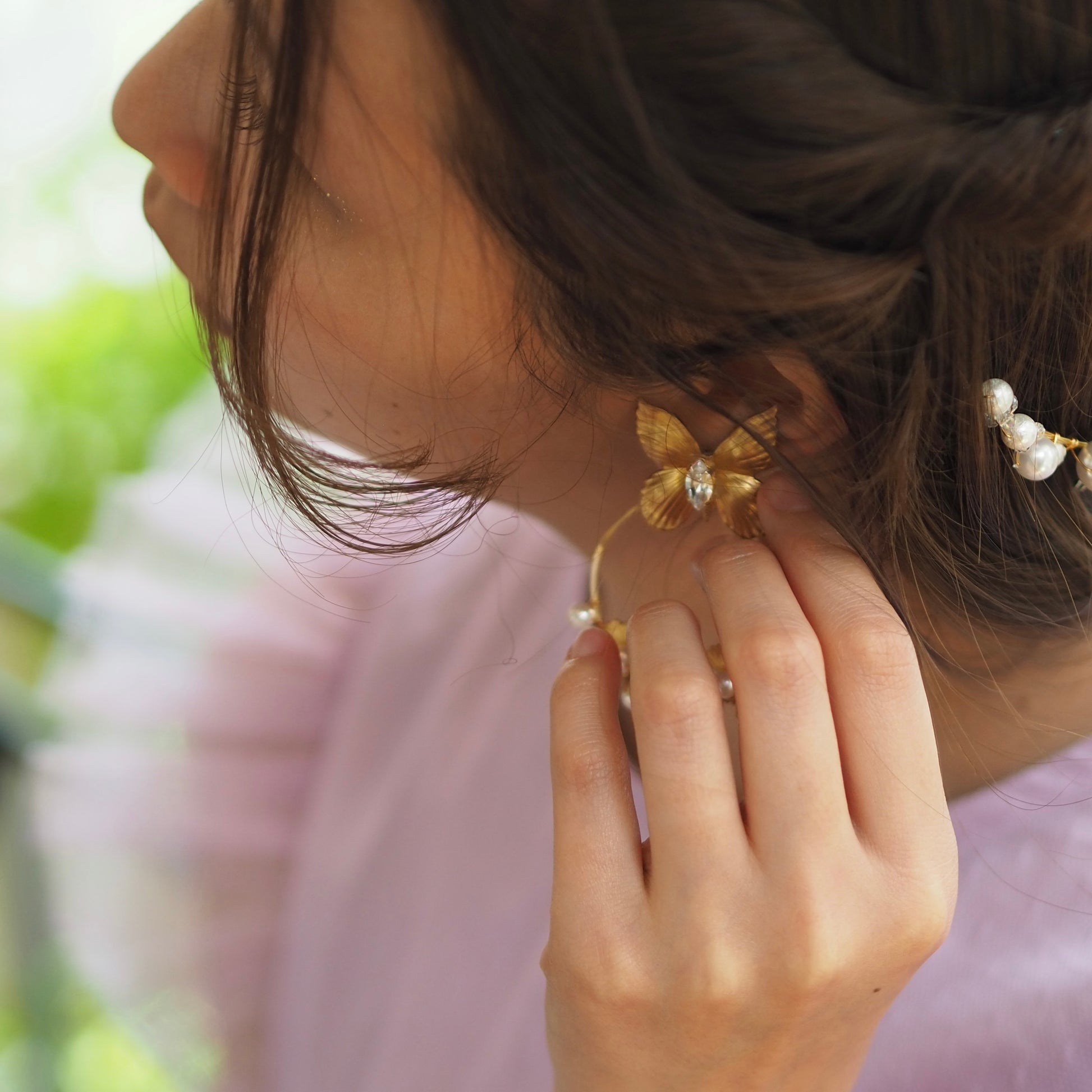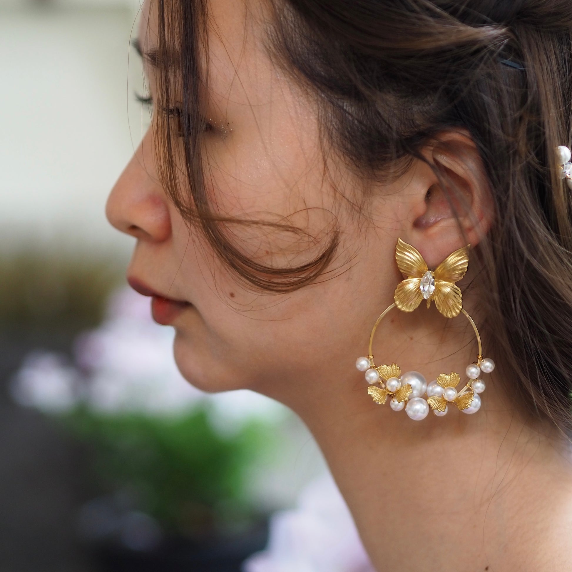 大ぶりの蝶々と沢山のパールで華やかなピアス&イヤリングです🦋流行りのフープブーケをモチーフに仕上げました💐春らしくお洒落な花嫁様におすすめの新作💕ロング花嫁様はもちろん、ショート花嫁様にもお似合いですよ✨フープ部分は取り外しが可能な2wayタイプとなっております◎