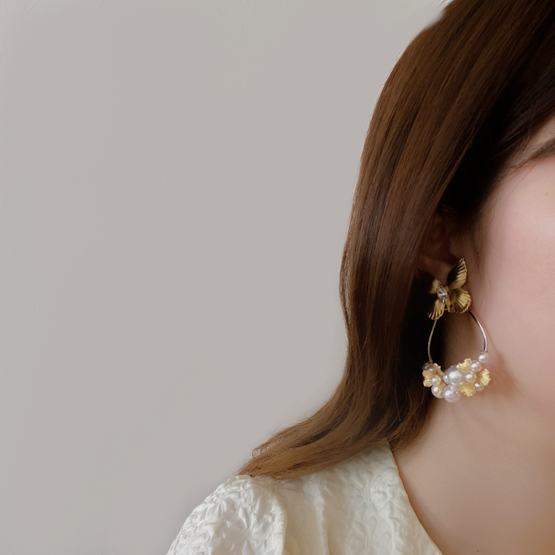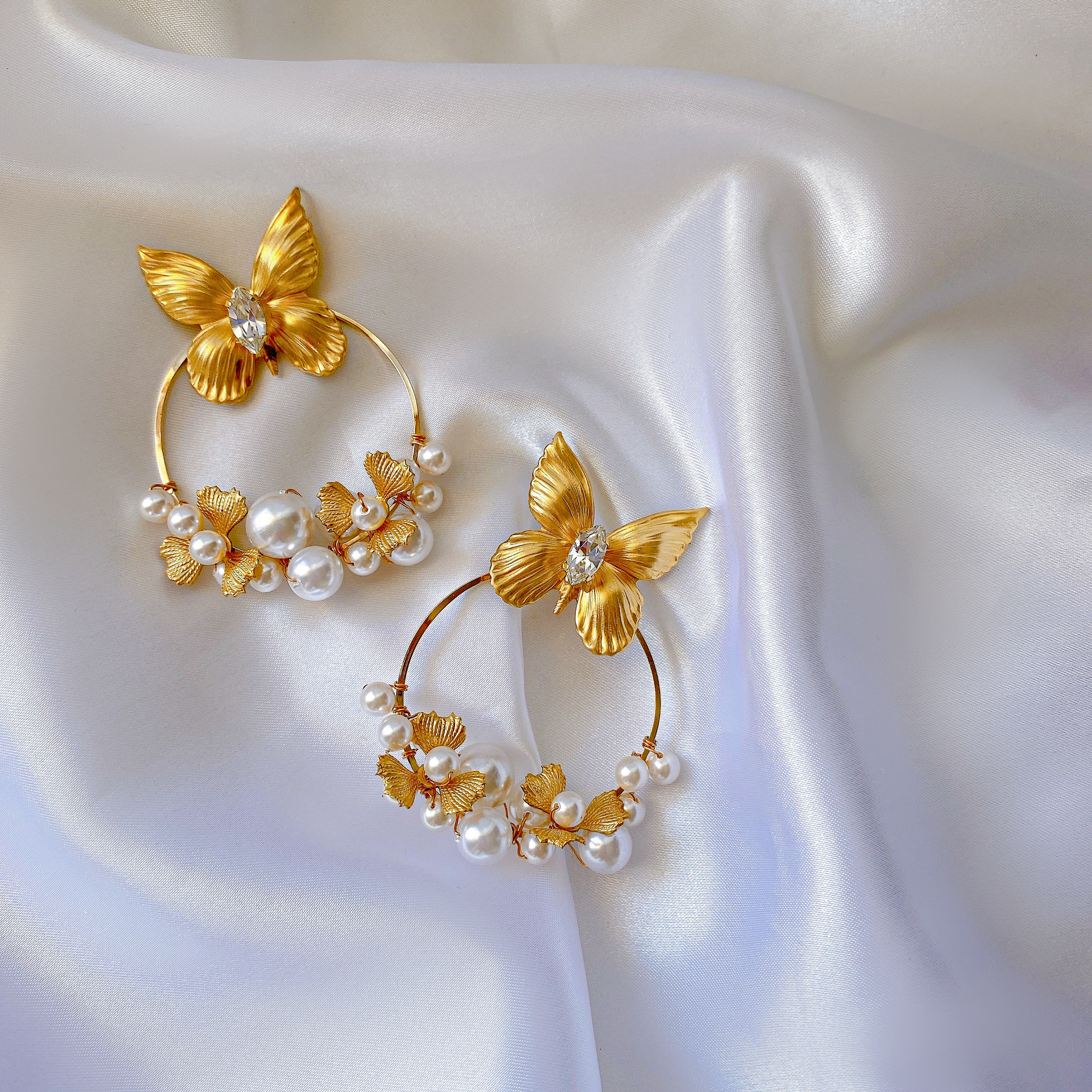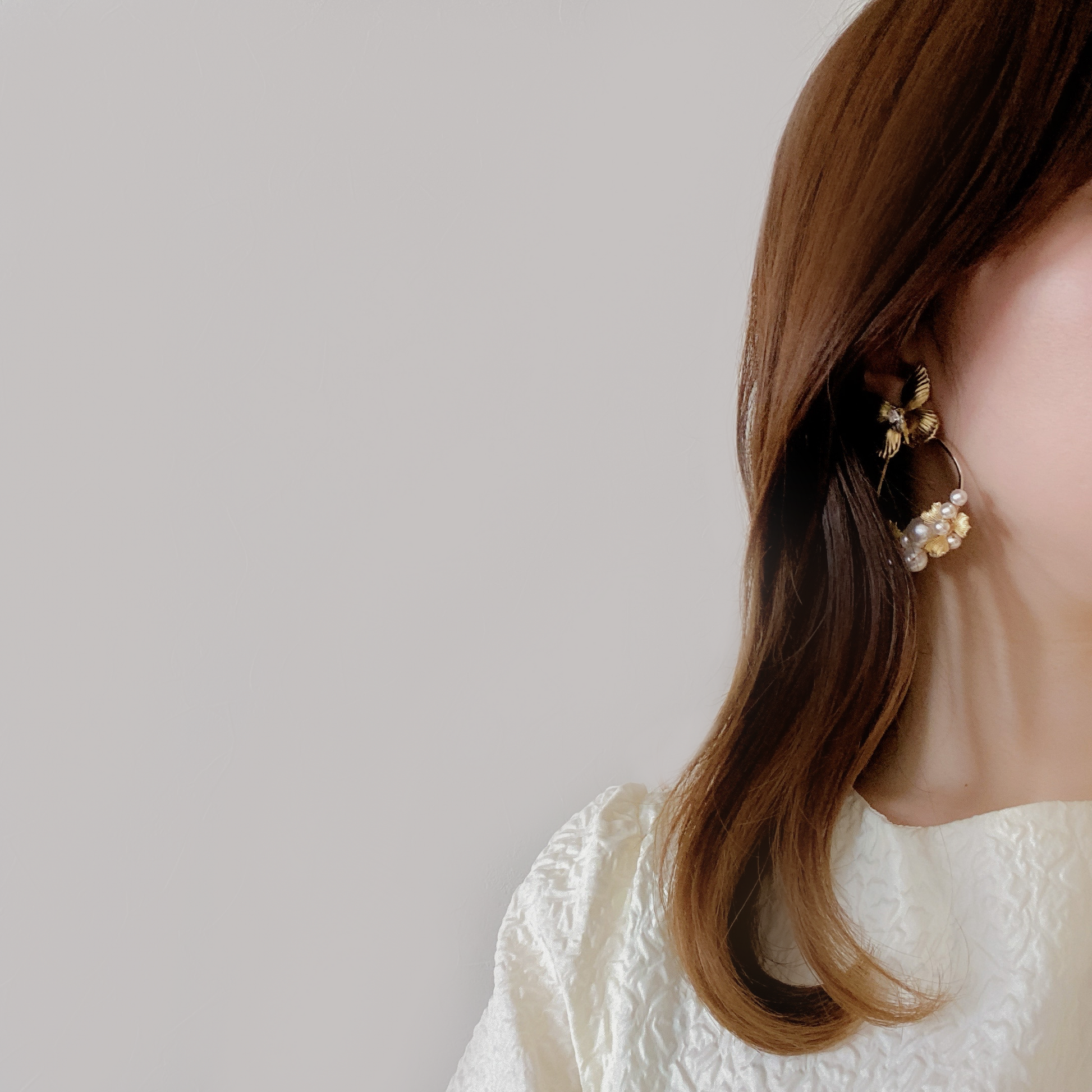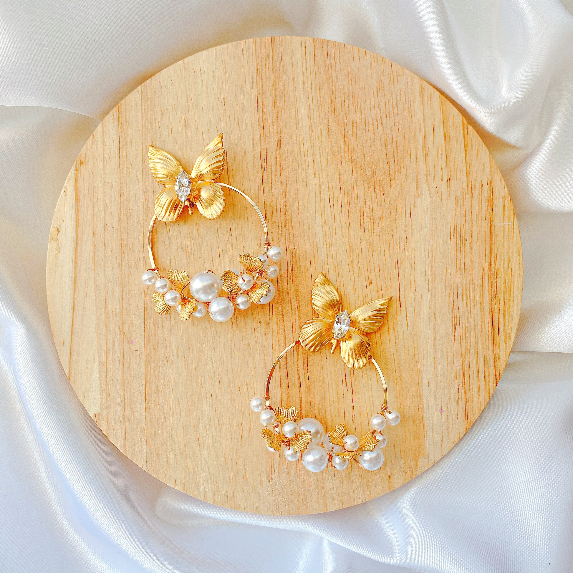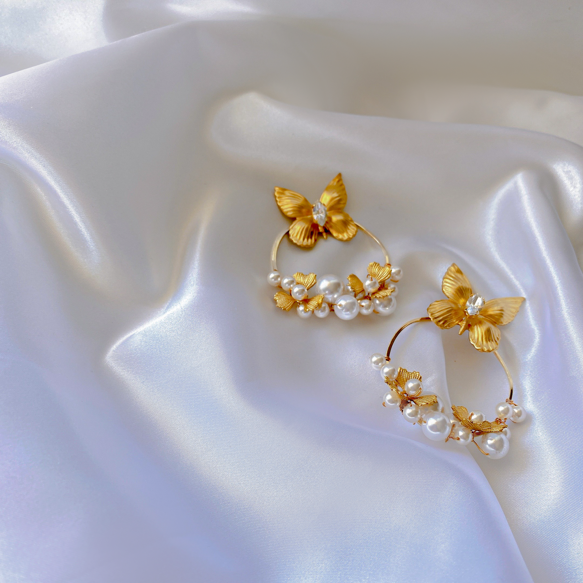 大ぶりの蝶々と沢山のパールで華やかなピアス&イヤリングです🦋流行りのフープブーケをモチーフに仕上げました💐春らしくお洒落な花嫁様におすすめの新作💕ロング花嫁様はもちろん、ショート花嫁様にもお似合いですよ✨フープ部分は取り外しが可能な2wayタイプとなっております◎
