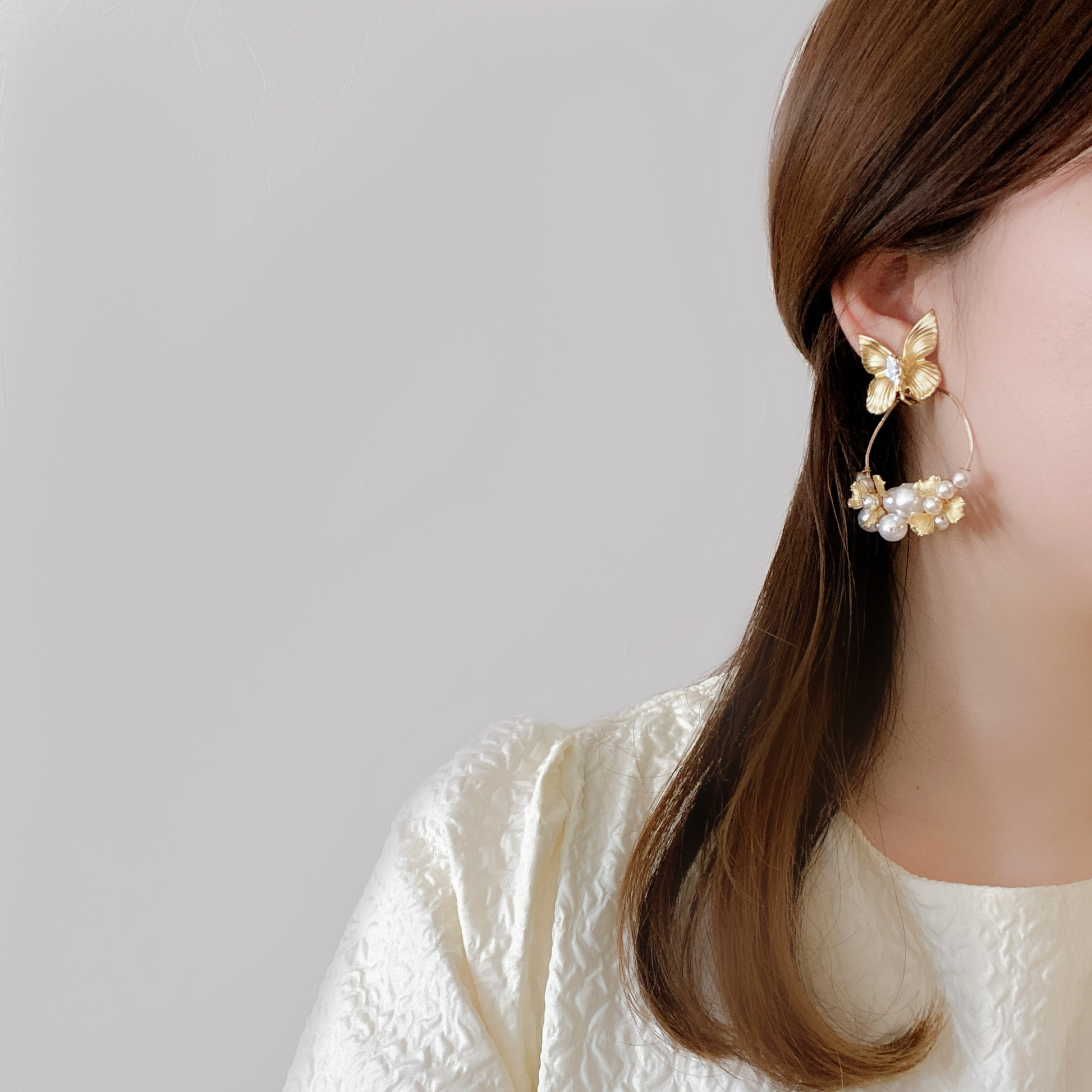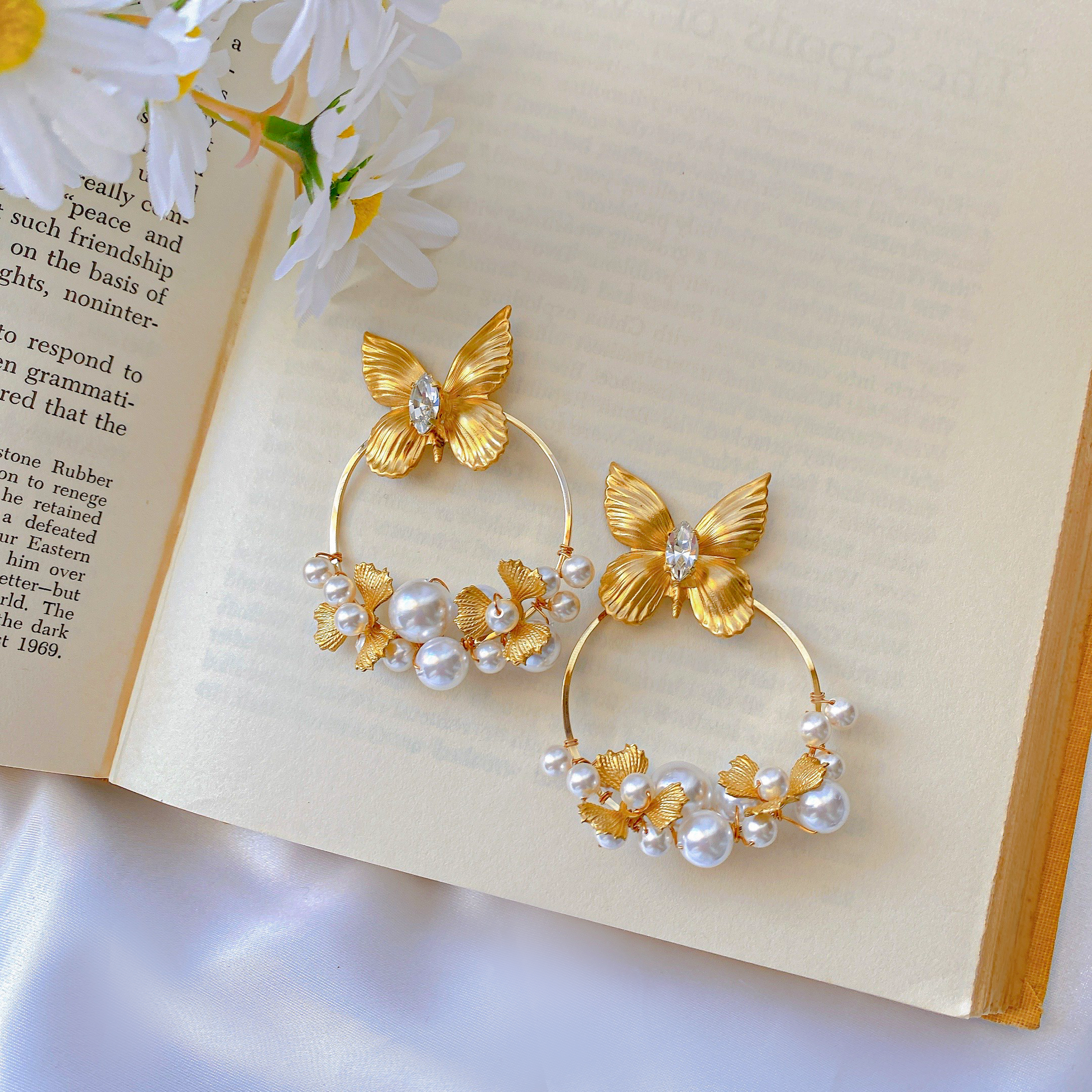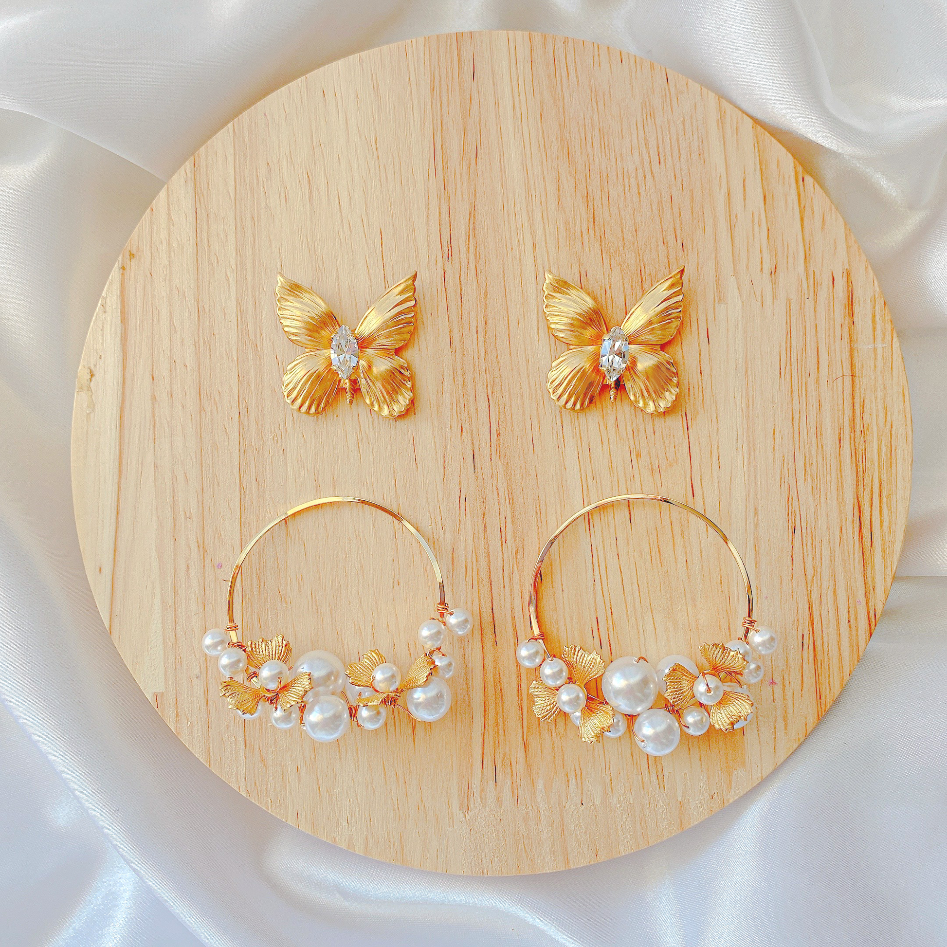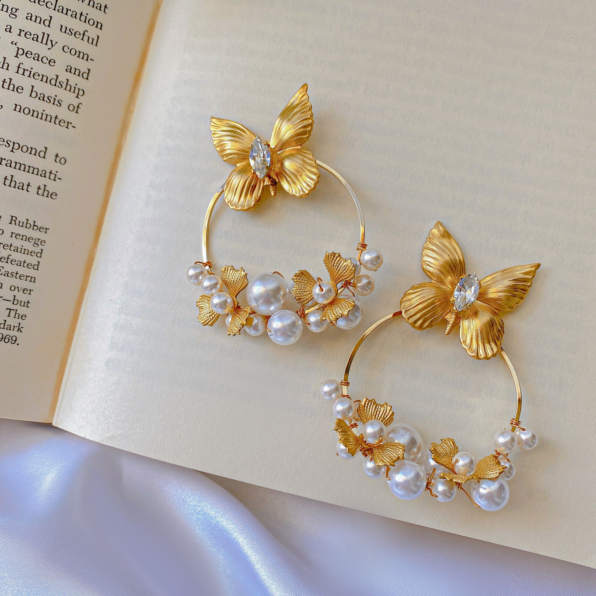 大ぶりの蝶々と沢山のパールで華やかなピアス&イヤリングです🦋流行りのフープブーケをモチーフに仕上げました💐春らしくお洒落な花嫁様におすすめの新作💕ロング花嫁様はもちろん、ショート花嫁様にもお似合いですよ✨フープ部分は取り外しが可能な2wayタイプとなっております◎