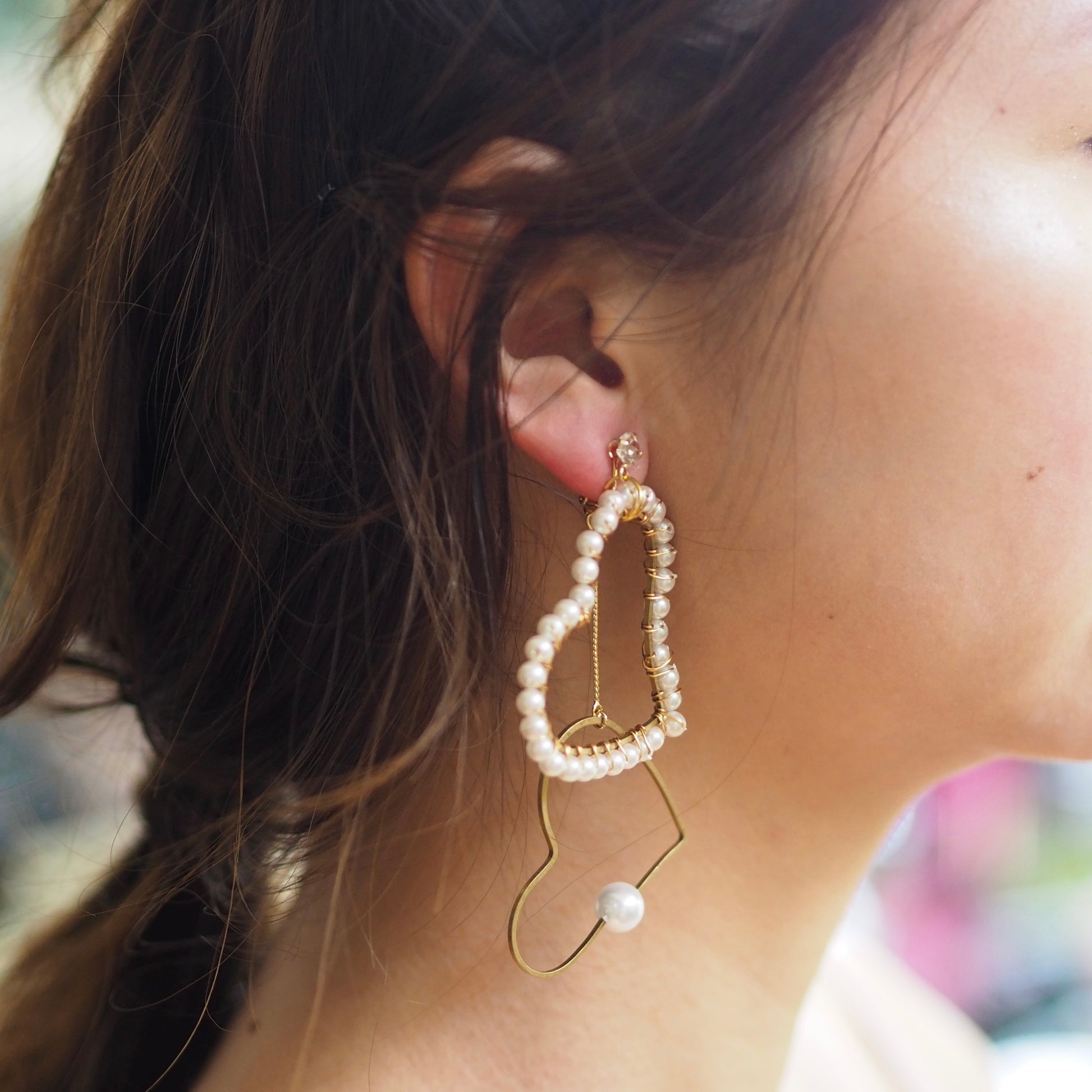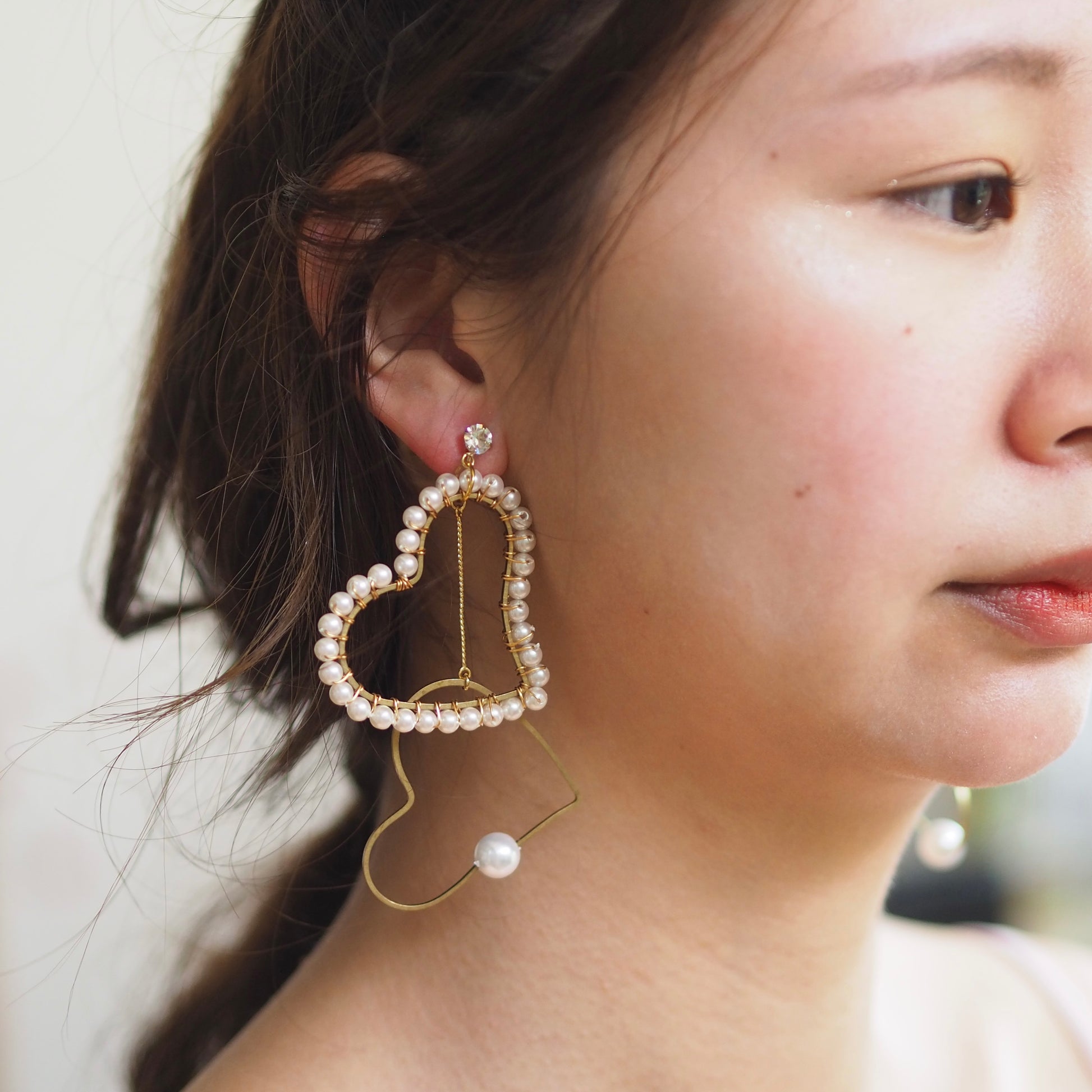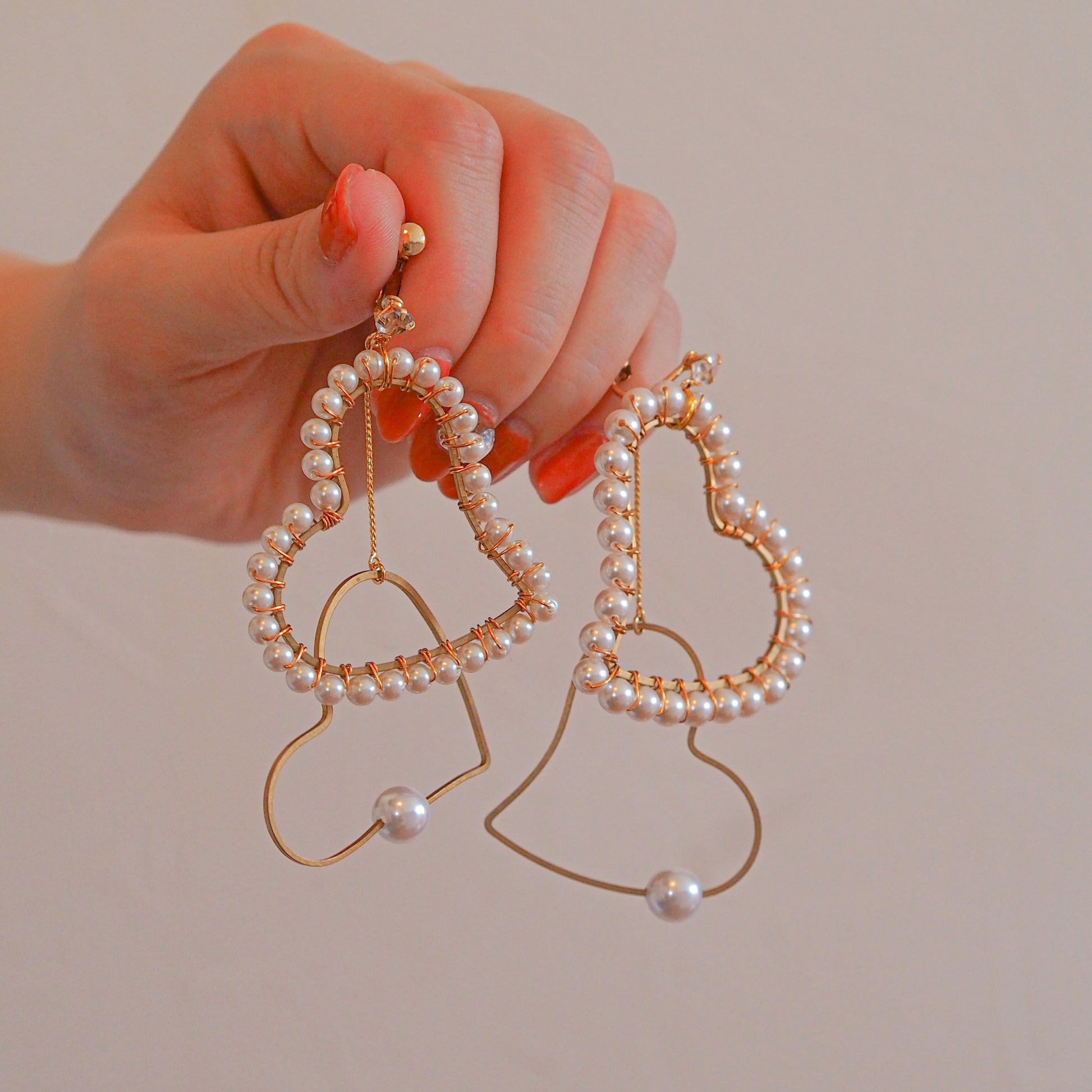 可愛すぎる大きなハートをメインにしたピアス&イヤリングです💕2連のヴィンテージハートが目を引くデザインで、揺れるととっても可愛いです✨パールを沢山編み込み、キュートガーリーなデザインに仕上げました🩰🤍ヘアアップしてピアスをメインにしても素敵です💌