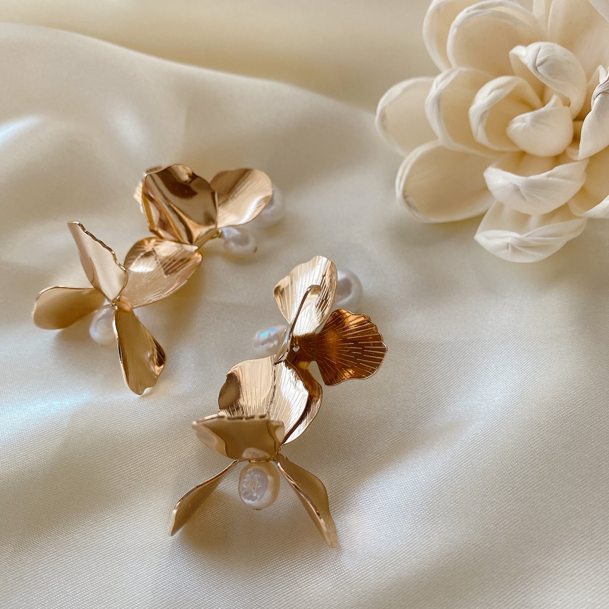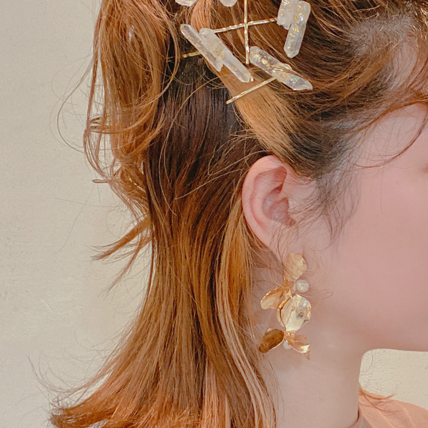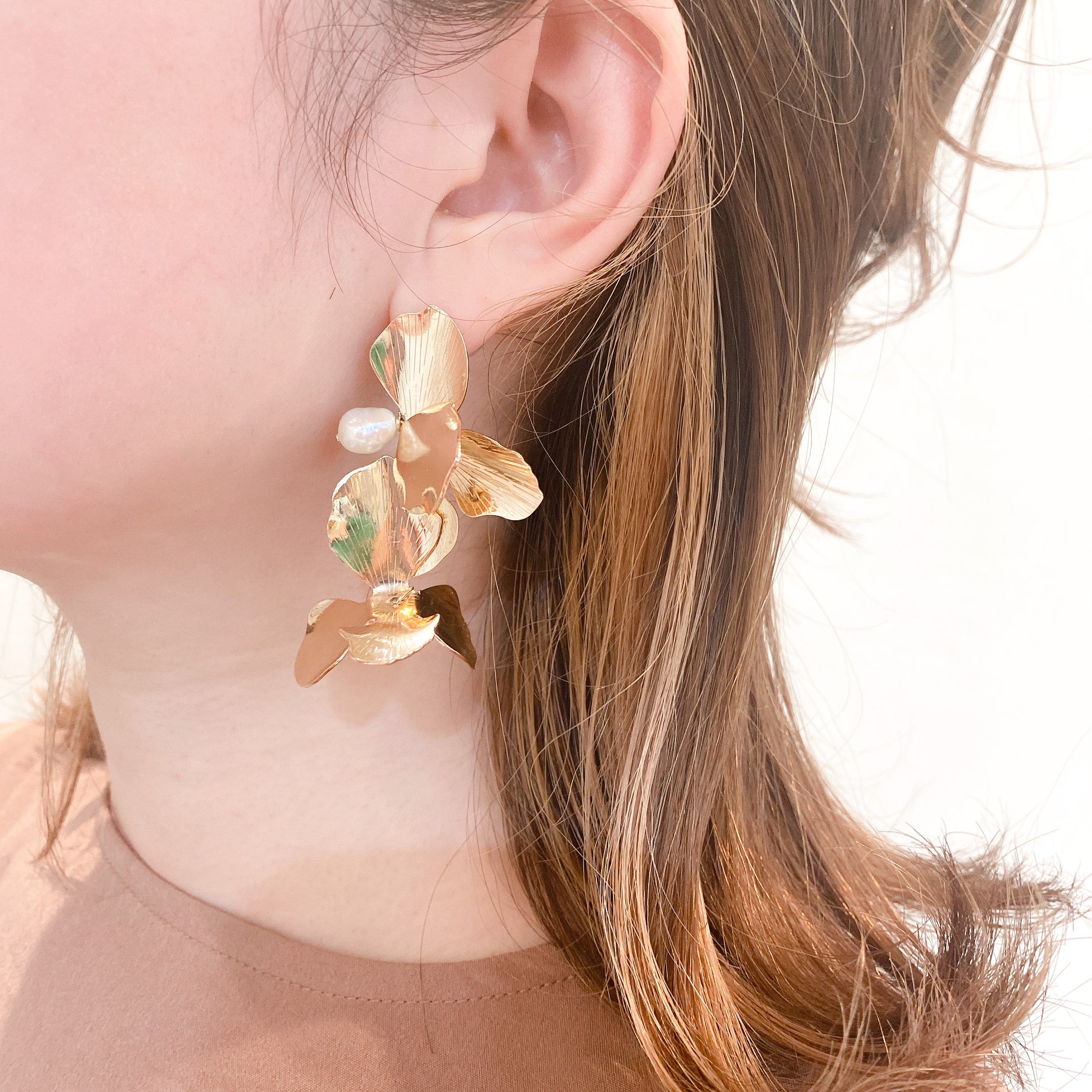 ピカピカと輝くピンクゴールドのフラワーを重ねて、立体感がある大人ガーリーなアクセサリー🌼ピアスのキャッチはパールを使用しており、後から見てもキュート感を演出💕普段使いにもお呼ばれコーデにもぴったりです🕊✨