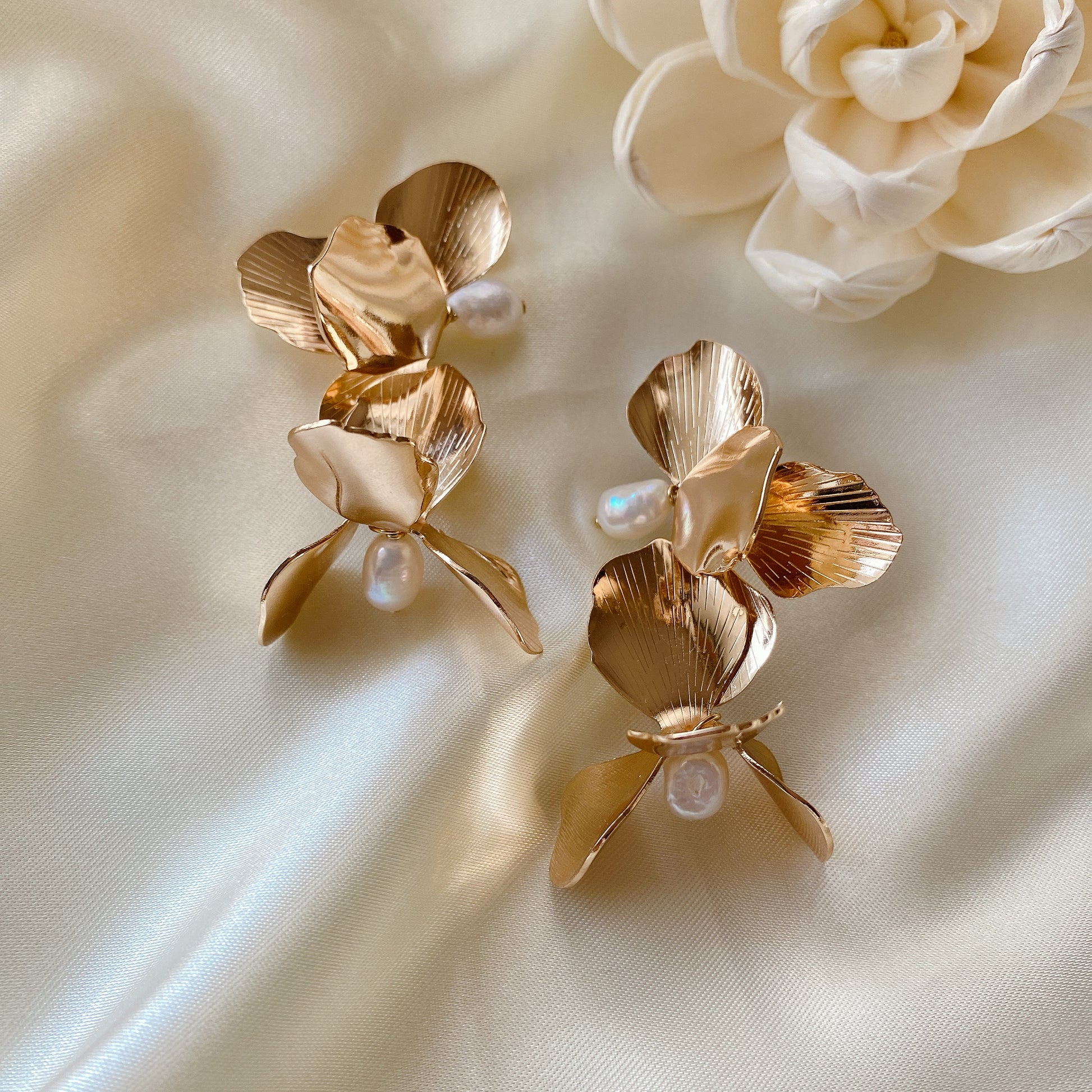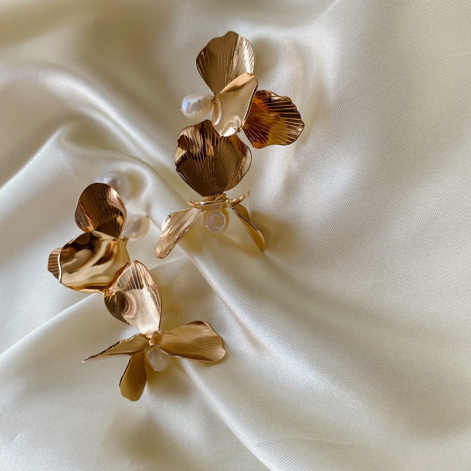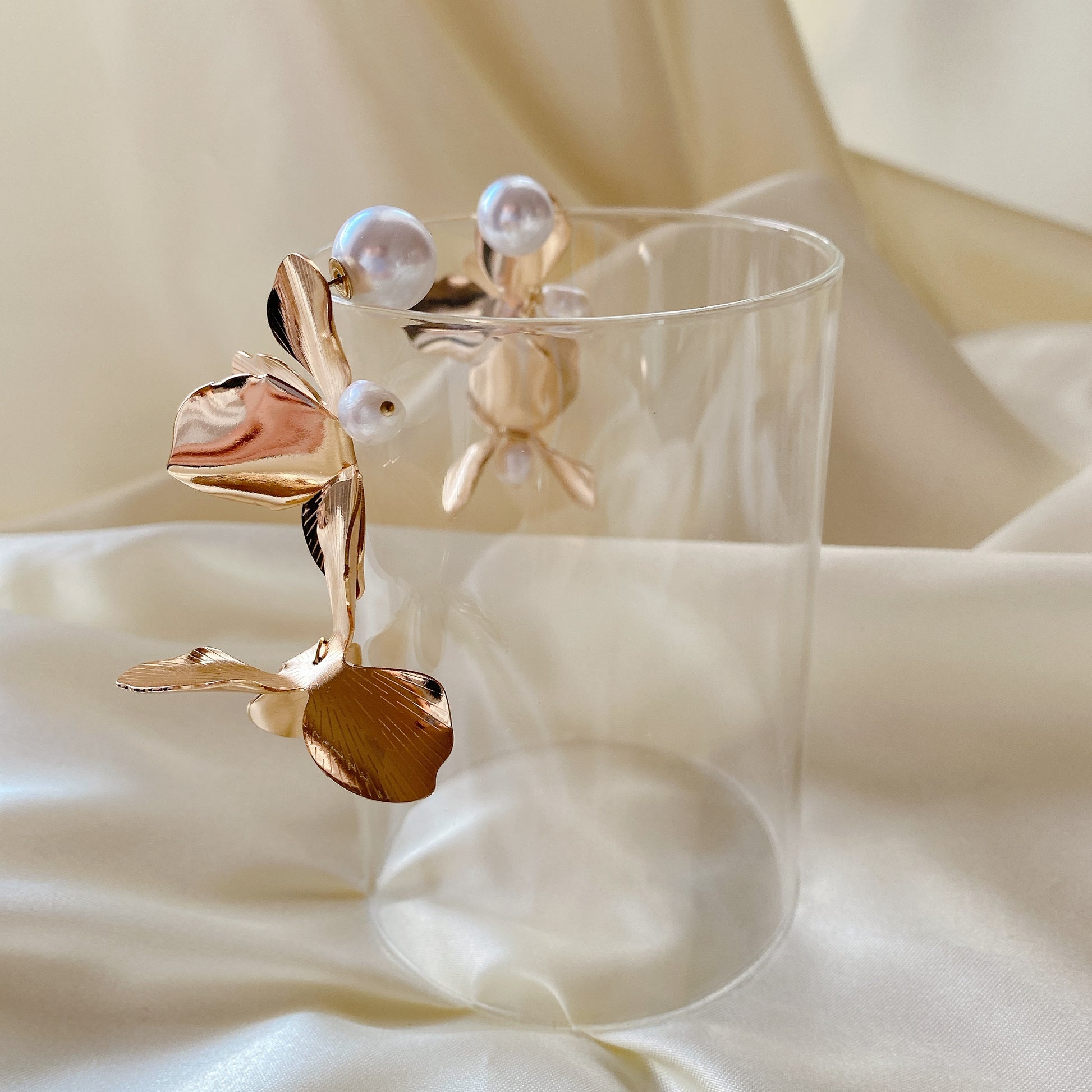 ピカピカと輝くピンクゴールドのフラワーを重ねて、立体感がある大人ガーリーなアクセサリー🌼ピアスのキャッチはパールを使用しており、後から見てもキュート感を演出💕普段使いにもお呼ばれコーデにもぴったりです🕊✨